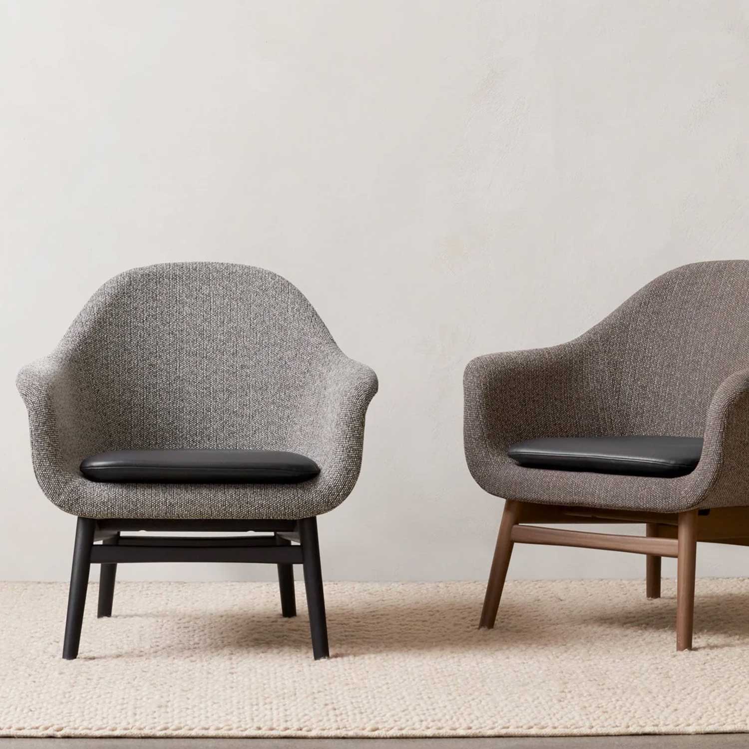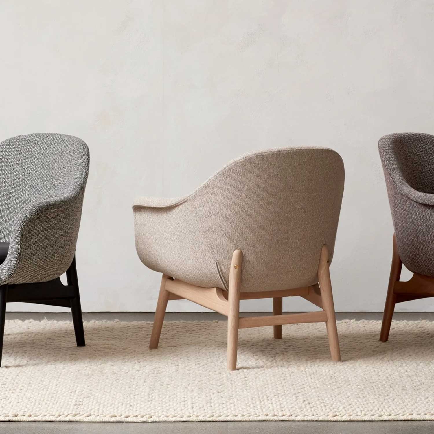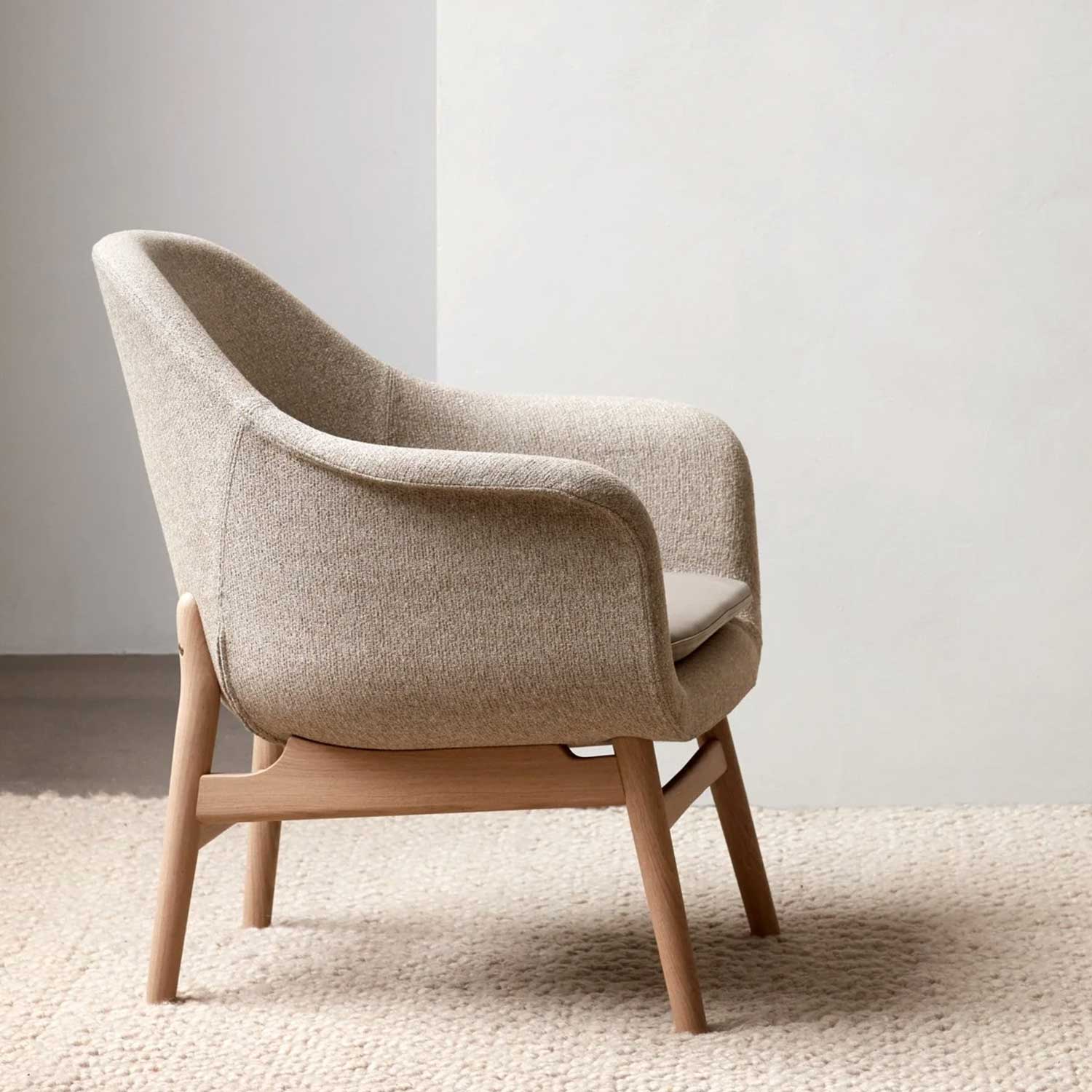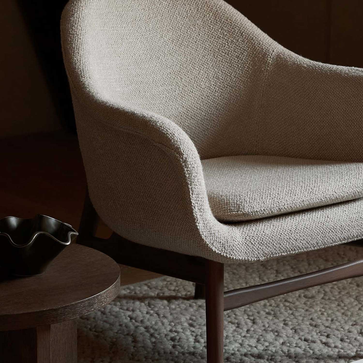 Der Audo - Harbour Loungesessel ist ein Meisterwerk des modernen Designs, entworfen von Norm Architects. Mit seiner skulpturalen Silhouette und den organischen Linien verkörpert dieser Sessel die Essenz des skandinavischen Mid-Century-Stils kombiniert mit brasilianischer Modernität. Er ist ein weiteres Mitglied der Harbour-Kollektion und behält die solide und dennoch leichte Konstruktion natürlich bei. Die gepolsterte Schale ruht auf einem Massivholrahmen und ist mit sanft geschwungen Seiten und einer abgewinkelten Rückenlehne versehen. Dieses Design vermittelt das Gefühl getragen und gestützt zu werden und lädt damit zu völliger Entspannung ein. Der Rahmen ist in verschiedenen Ausführungen erhältlich: naturbelassen, dunkel gebeizter oder schwarzer Eiche sowie Walnuss. Der niedrige Rahmen ist mit abgerundete Beinen versehen und zeichnet sich durch subtile Tischlerdetails aus.