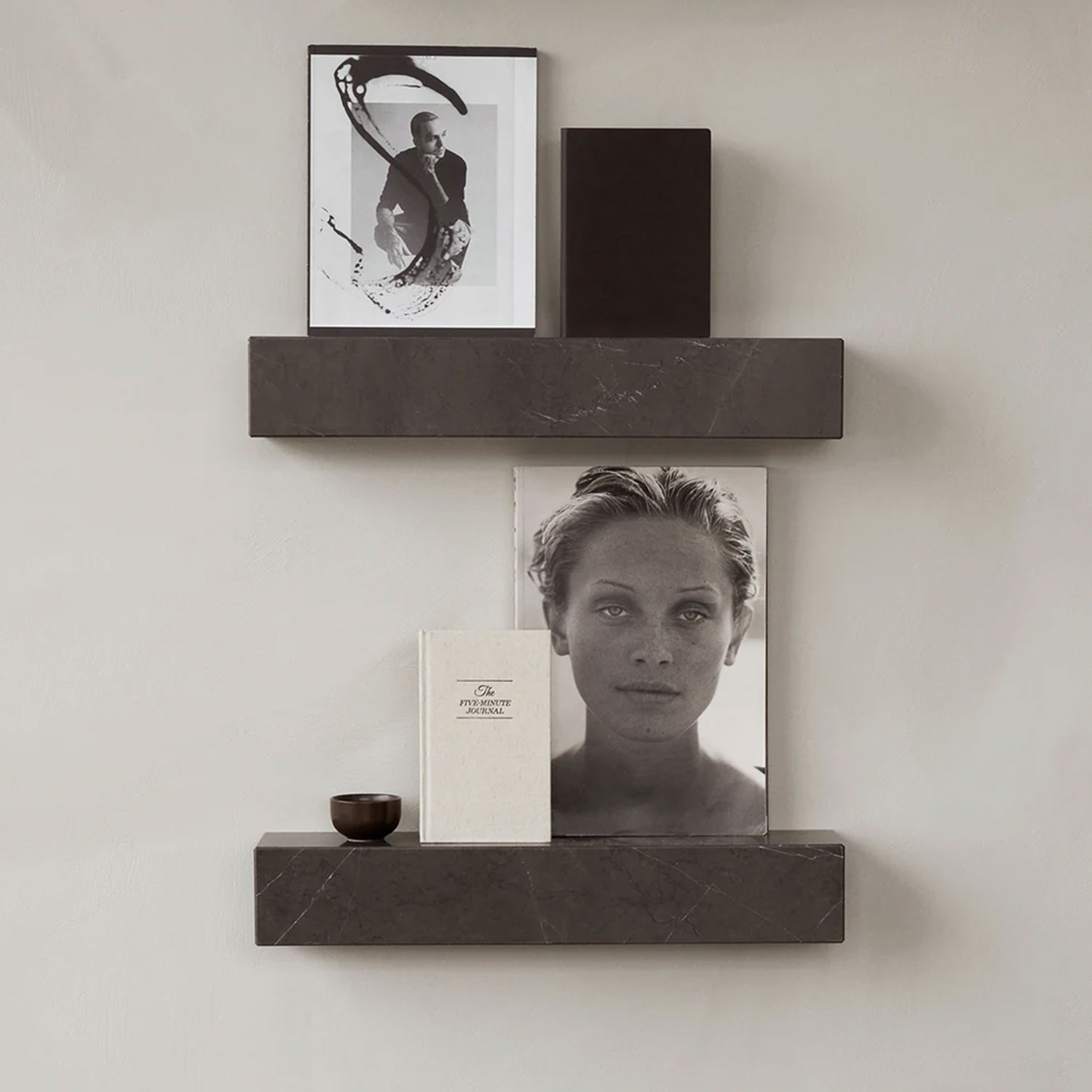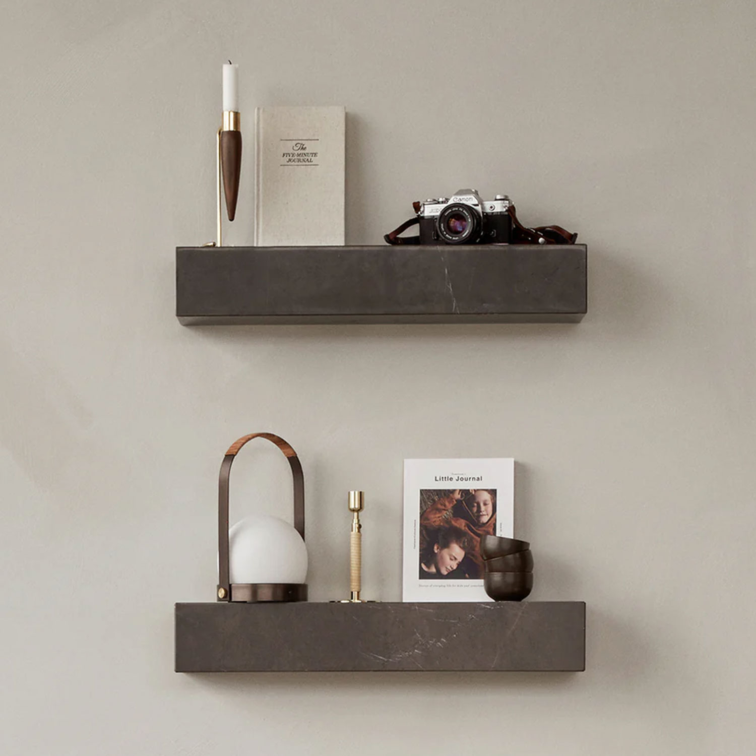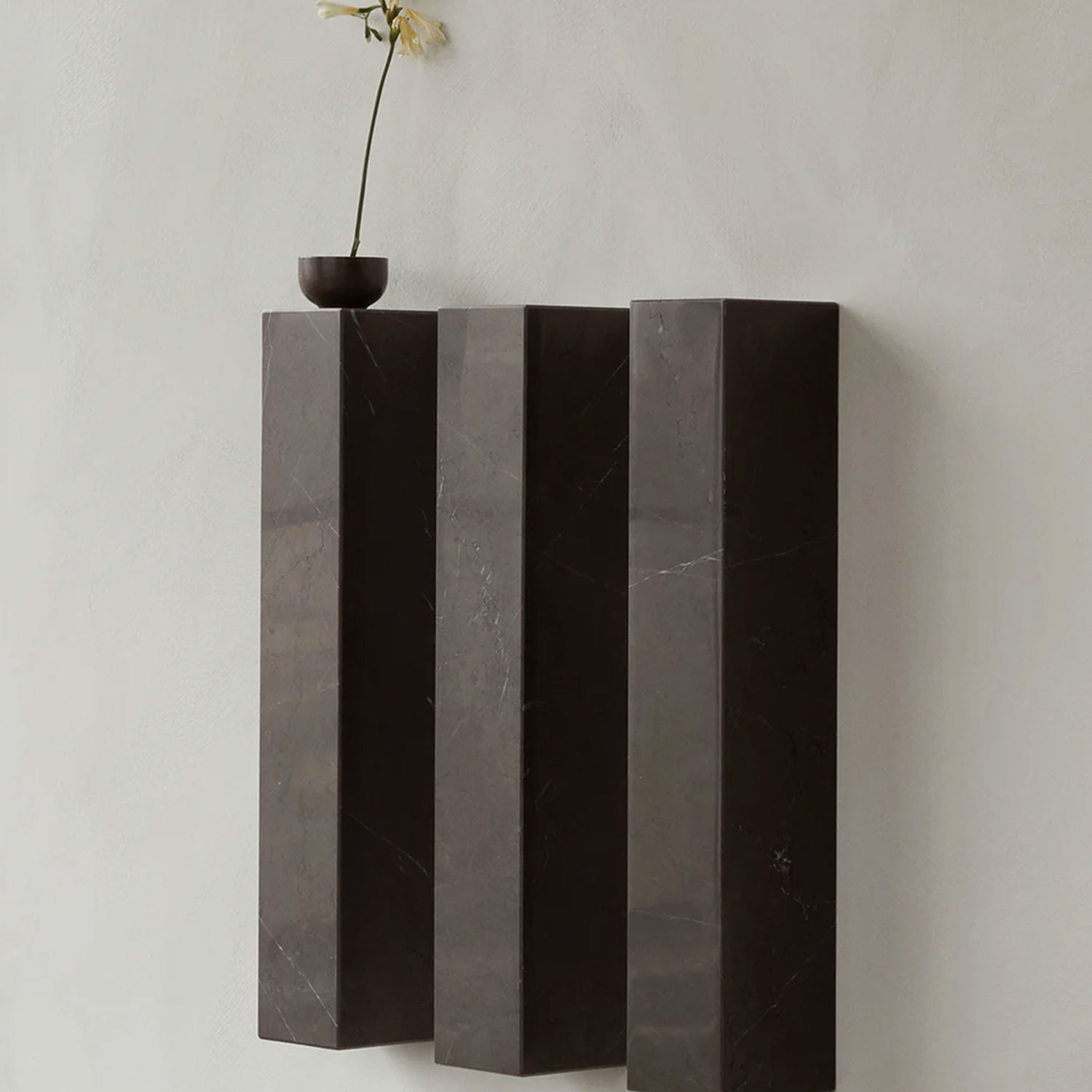 Das Audo - Plinth Shelf ist ein minimalistisches Wandregal, entworfen von Norm Architects, das durch seine skulpturale Formgebung und die Verwendung hochwertiger Materialien besticht. Mit seiner klaren Linienführung und der präzisen Verarbeitung setzt es stilvolle Akzente in jedem Raum. Es ist entweder aus dem grauen Kendzo-Marmor oder dem sandfarbenen Kunis Breccia-Stein geformt. Der geschliffene Marmor oder Stein vermitteln einen Hauch von Raffinesse und Eleganz und werten jeden Raum unmittelbar auf. Das Regal ist 60 cm lang und sowohl ein Designobjekt als auch funktional. Es kann vertikal oder horizontal an der Wand befestigt werden, sodass es sowohl als praktisches Regal als auch als eigenständiges Designobjekt genutzt werden kann. Für Bilder, Bücher, Vasen, Deko-Objekte oder als Ausstellungsleiste – die Einsatzmöglichkeiten des Audo - Plinth Shelf sind vielfältig.
