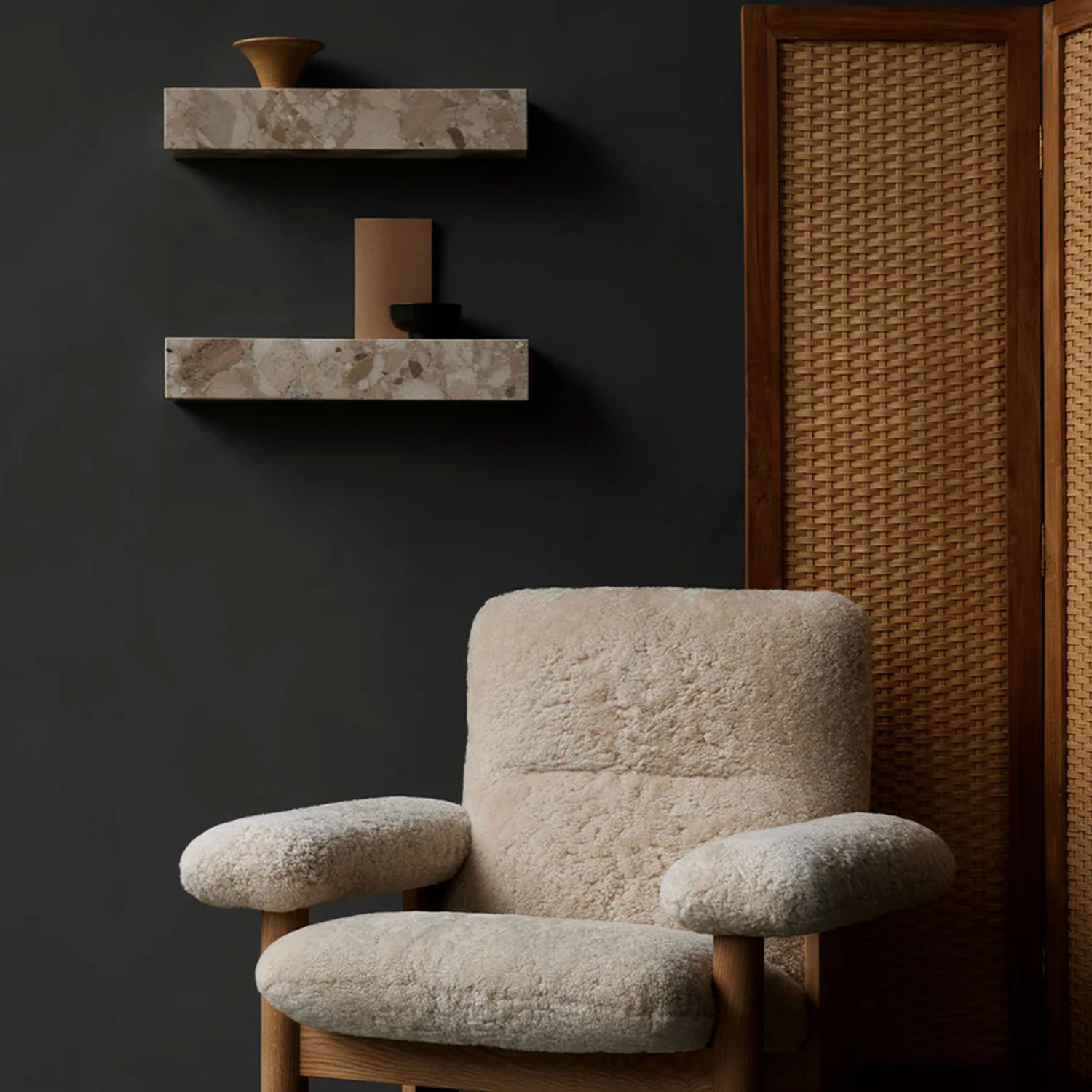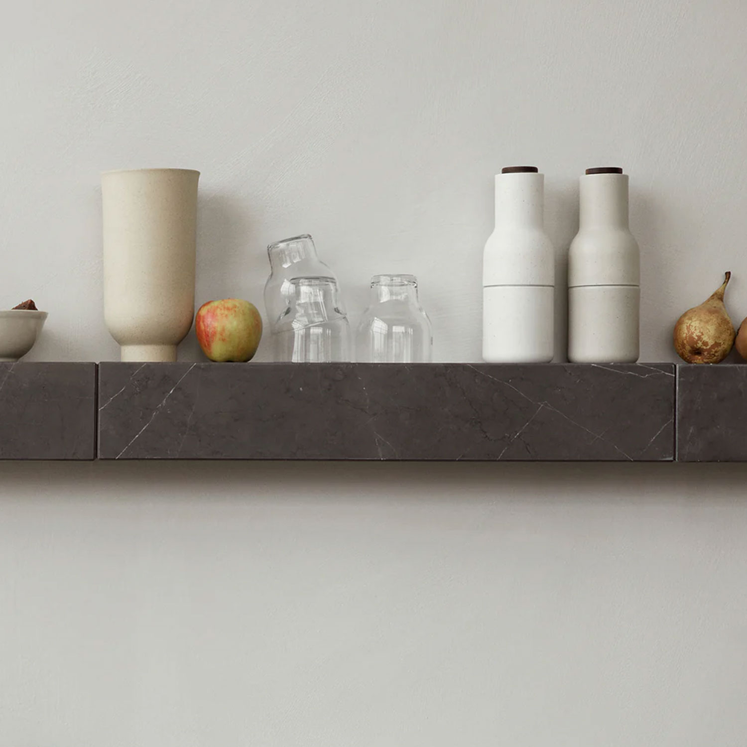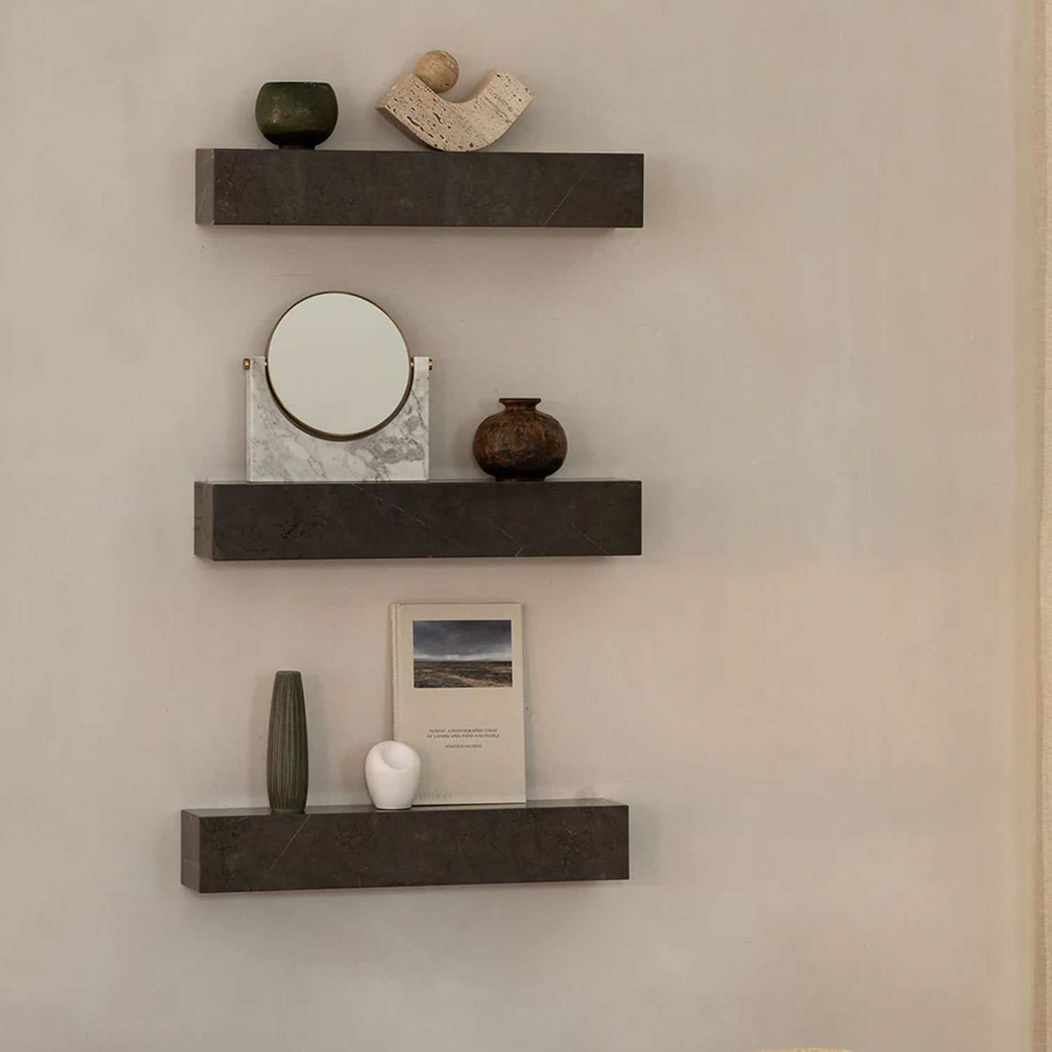 Das Audo - Plinth Shelf ist ein minimalistisches Wandregal, entworfen von Norm Architects, das durch seine skulpturale Formgebung und die Verwendung hochwertiger Materialien besticht. Mit seiner klaren Linienführung und der präzisen Verarbeitung setzt es stilvolle Akzente in jedem Raum. Es ist entweder aus dem grauen Kendzo-Marmor oder dem sandfarbenen Kunis Breccia-Stein geformt. Der geschliffene Marmor oder Stein vermitteln einen Hauch von Raffinesse und Eleganz und werten jeden Raum unmittelbar auf. Das Regal ist 60 cm lang und sowohl ein Designobjekt als auch funktional. Es kann vertikal oder horizontal an der Wand befestigt werden, sodass es sowohl als praktisches Regal als auch als eigenständiges Designobjekt genutzt werden kann. Für Bilder, Bücher, Vasen, Deko-Objekte oder als Ausstellungsleiste – die Einsatzmöglichkeiten des Audo - Plinth Shelf sind vielfältig.
