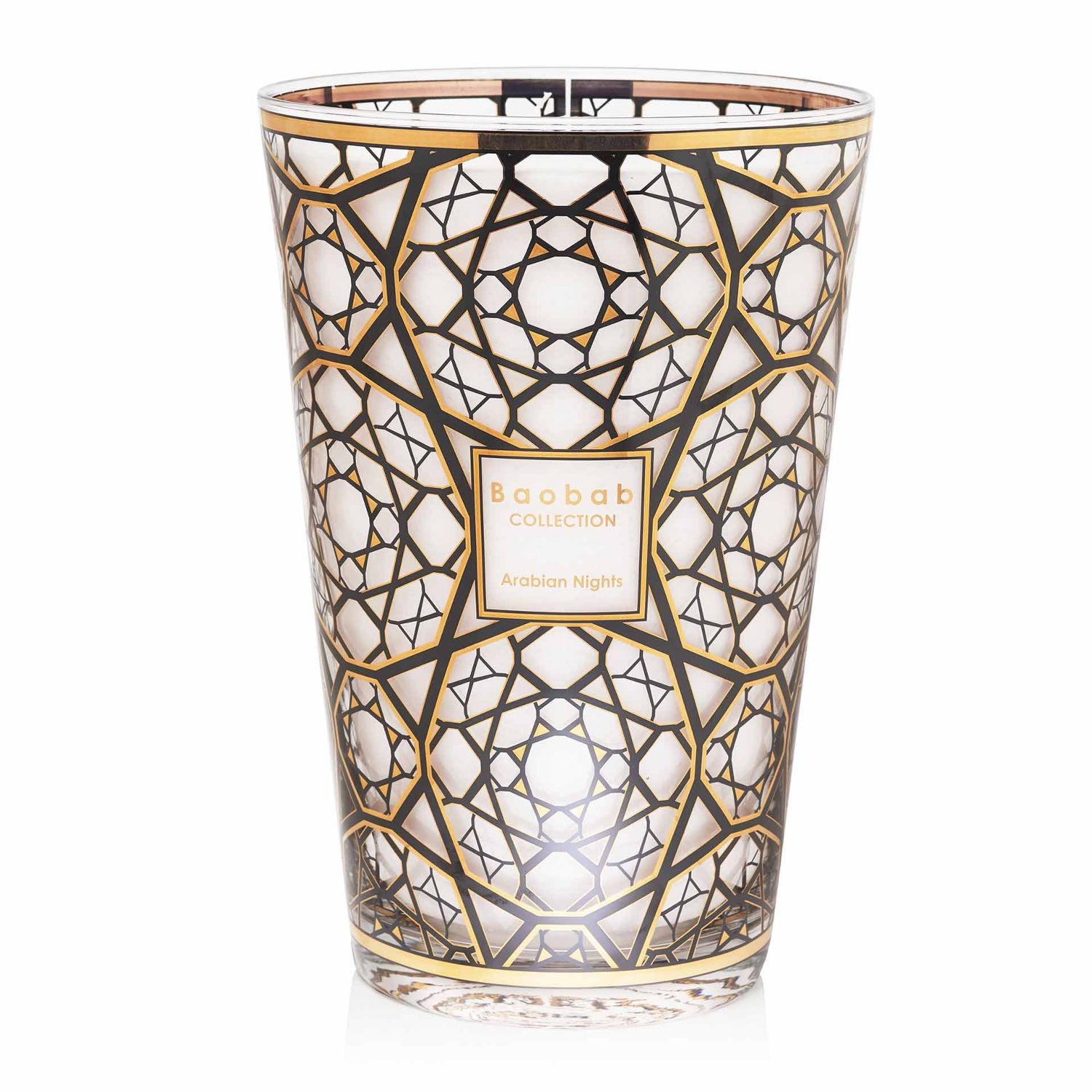 Die Baobab Collection Arabian Nights Duftkerze lädt Sie mit dem Duft von Oud, Safran und Weihrauch zu einer kleinen Traumreise in das Land von Tausendundeiner Nacht ein. Das Dekoglas ist hochwertig mit einem 24-karätigen Gold Siebdruck-Dekor verziert. Die Flamme der Baobab Kerze scheint leicht hindurch und zaubert ein Licht- und Schattenspiel.