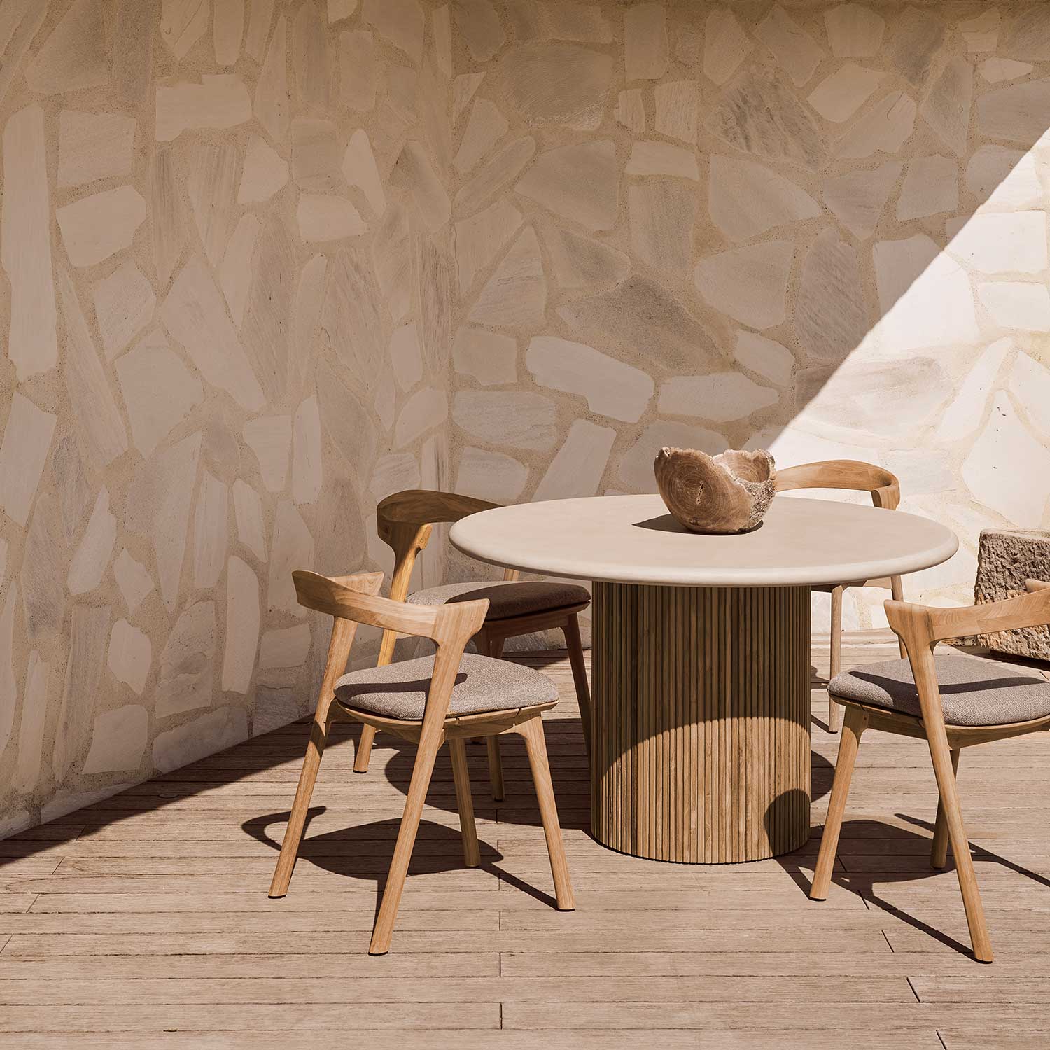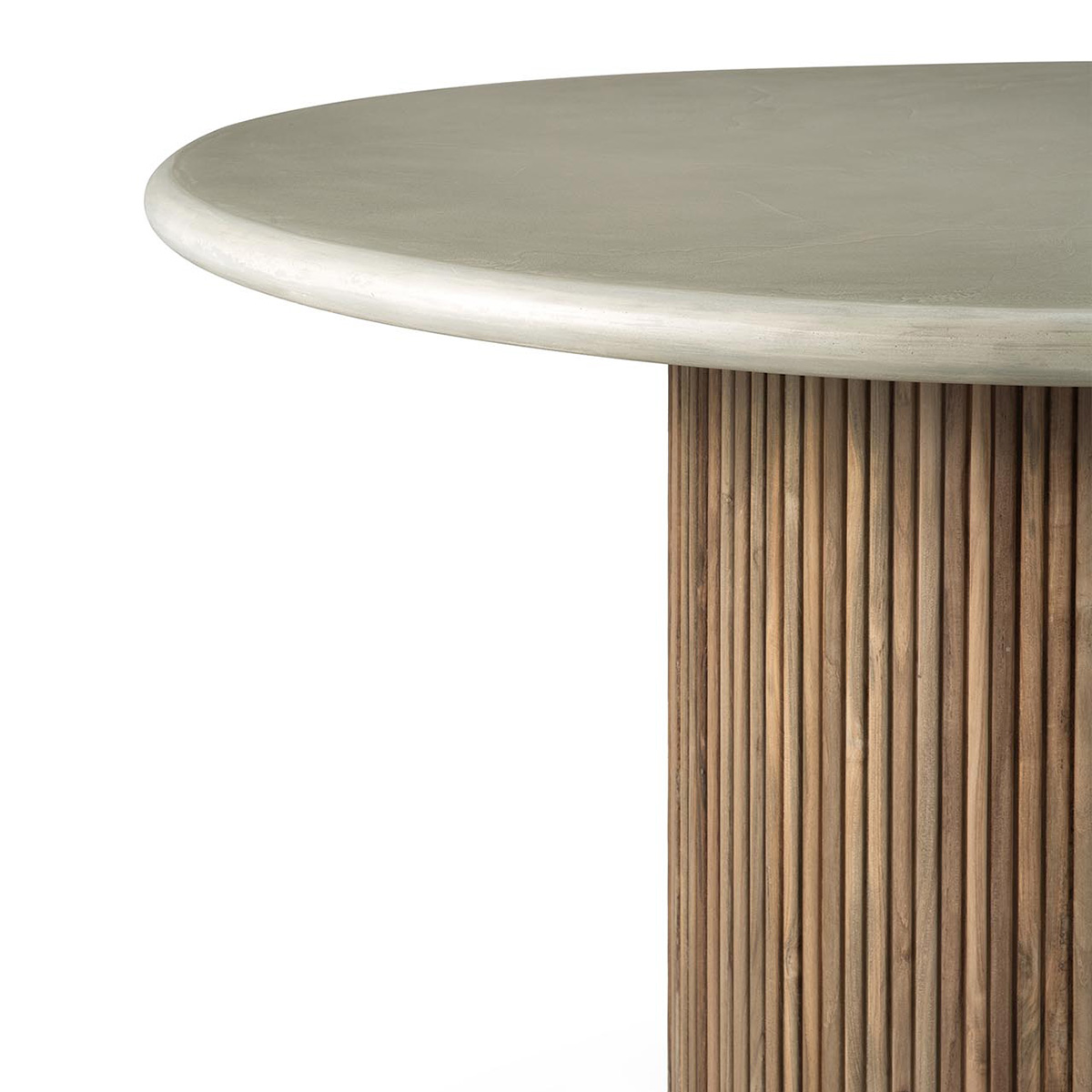 Die von Hand bearbeitete Beton-Tischplatte verleiht dem Roller Max Outdoor Tisch eine robuste, stilvolle Optik. Eine spezielle Schutzbeschichtung versiegelt die Oberfläche und macht sie unempfindlich gegenüber Flecken und Flüssigkeiten – perfekt für den täglichen Einsatz unter freiem Himmel. Getragen wird die Platte von einem soliden Gestell aus recyceltem, massivem Teakholz, das für seine natürliche Widerstandsfähigkeit und warme Ausstrahlung bekannt ist.