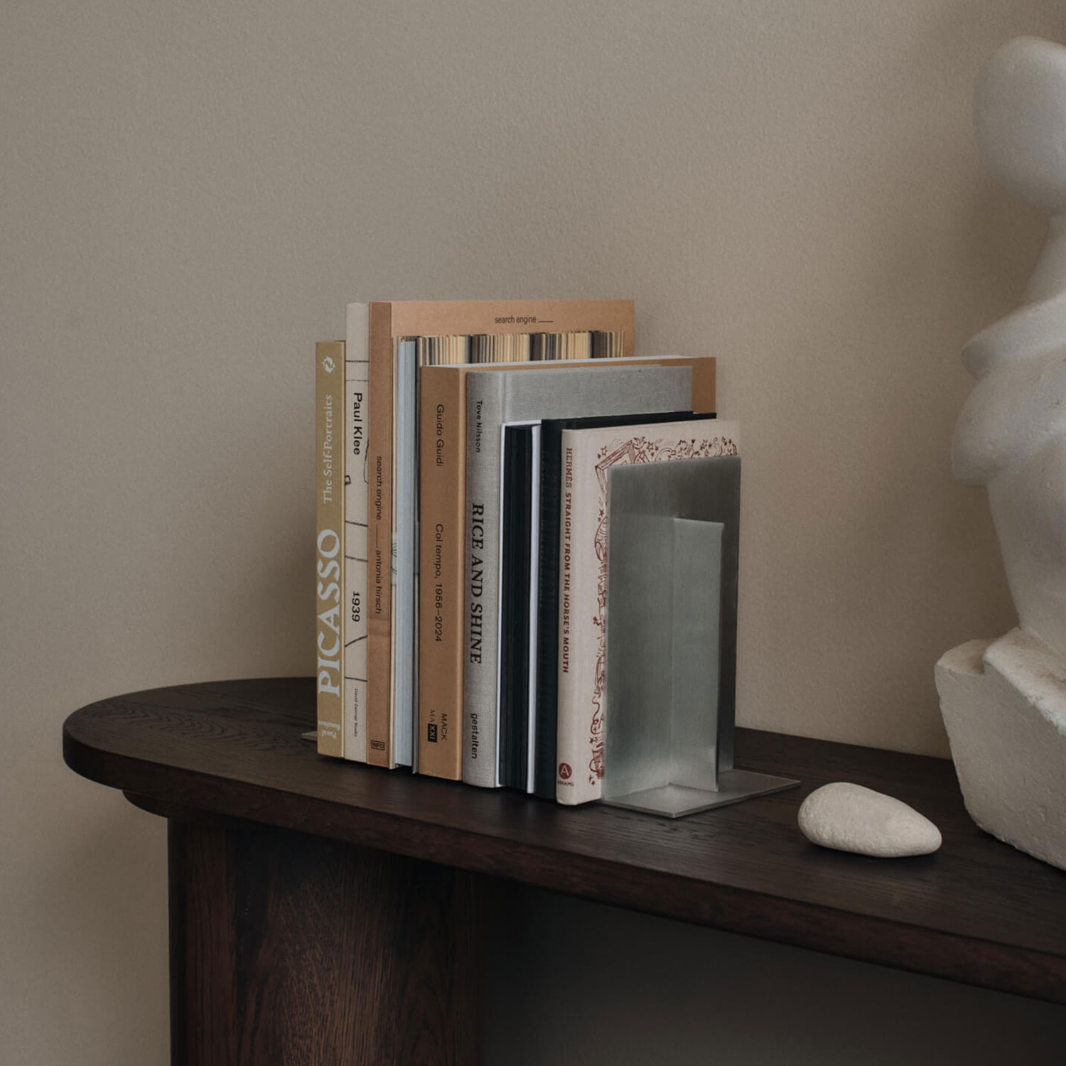 Die Buchstützen bestehen aus Aluminium und lassen sich einfach mit einem weichen, feuchten Tuch reinigen. Wichtig: Die Oberfläche sollte stets sauber und trocken gehalten werden, um die Materialqualität zu erhalten.