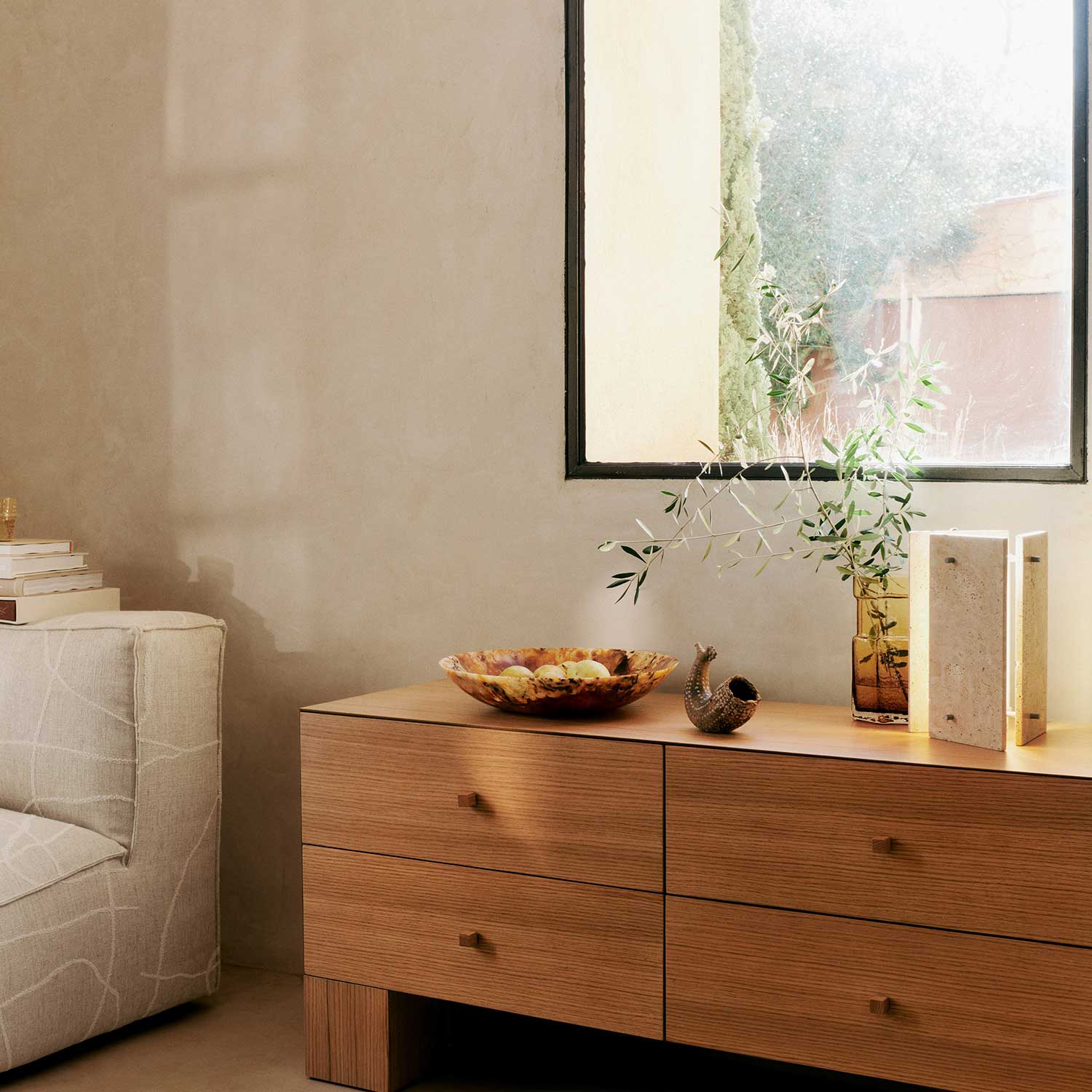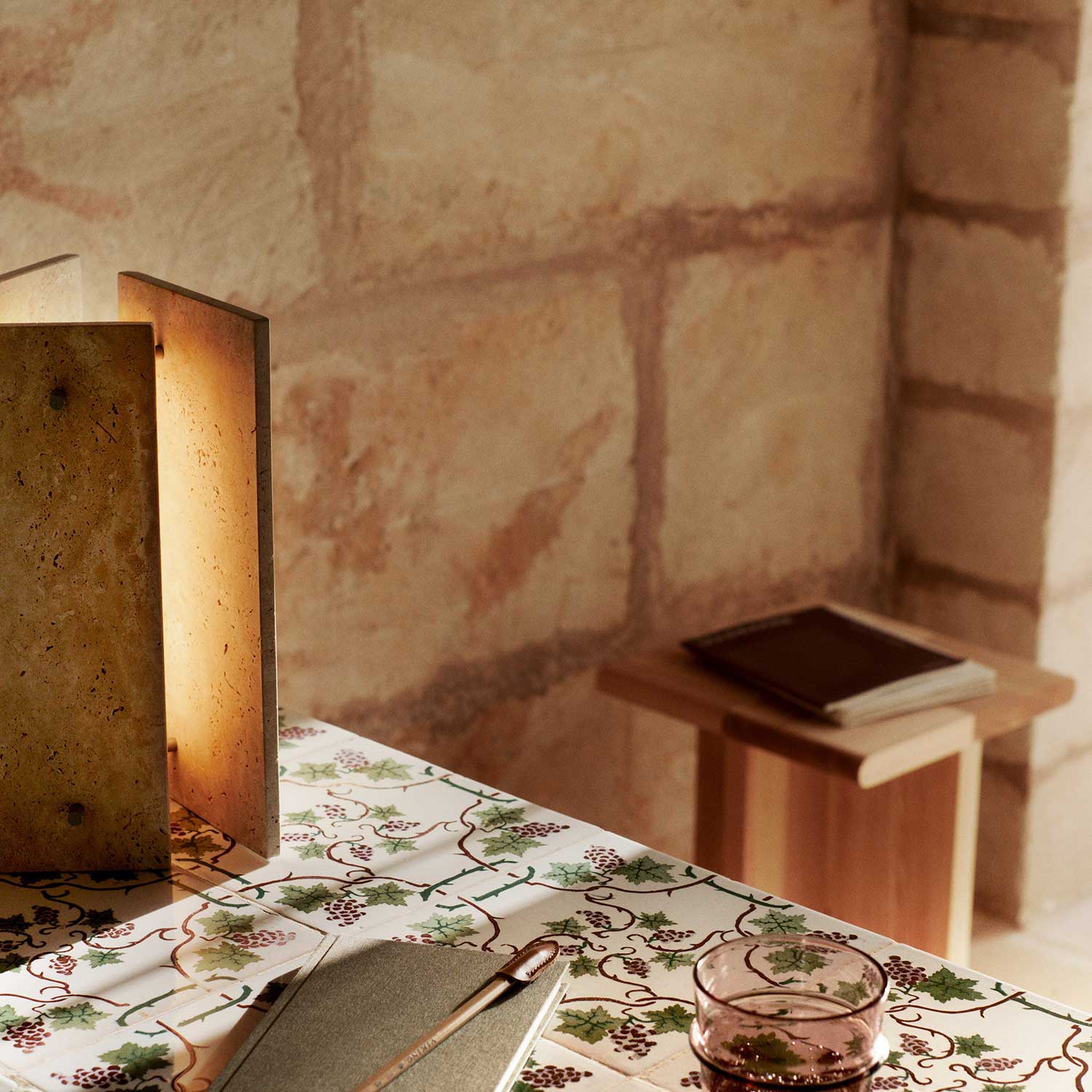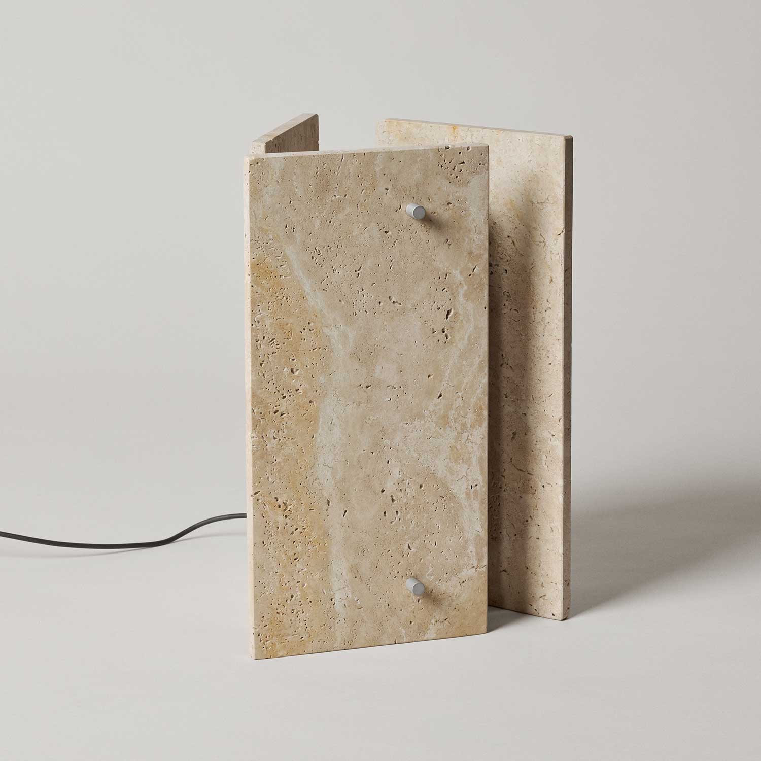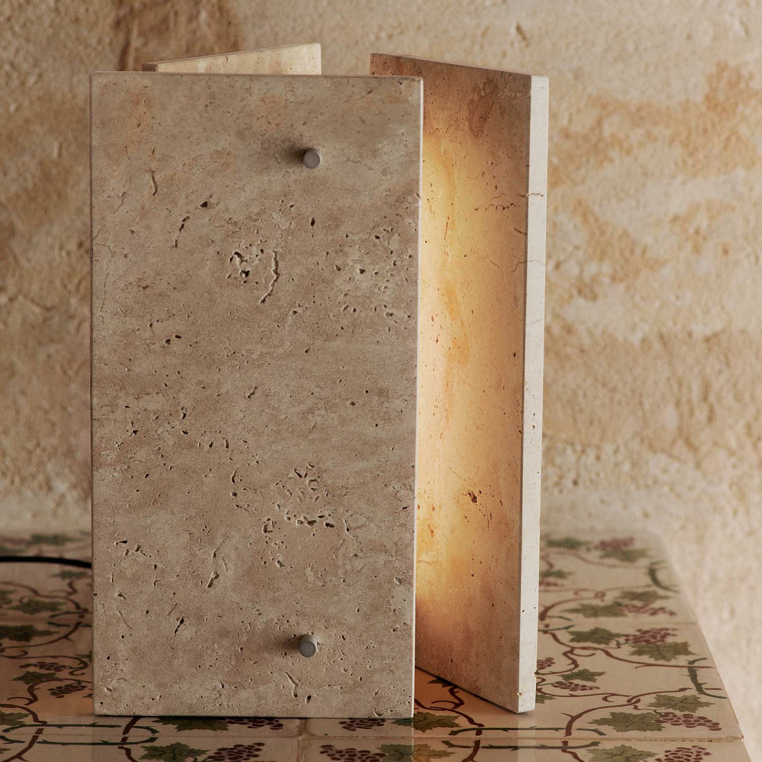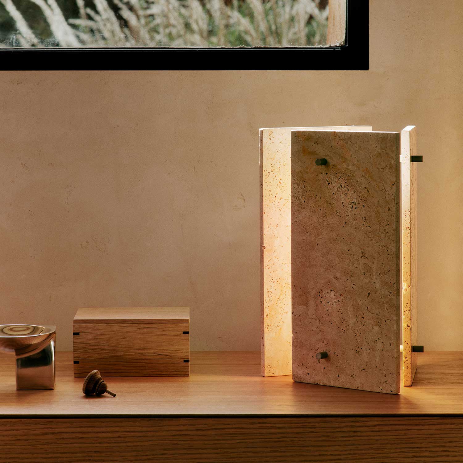 Die Ferm Living - Oeste Tischleuchte ist ein beeindruckendes Beispiel für skulpturales Design, das Funktionalität und Ästhetik harmonisch vereint. In den Farben Sand bzw. klar gehalten, fügt sie sich nahtlos in verschiedene Einrichtungsstile ein und setzt dabei kunstvolle Akzente. Ihre einzigartige Form und die sorgfältige Materialauswahl machen sie zu einem Highlight in jedem Raum. Sie besteht aus drei Travertin- bzw. Glasplatten, die um eine zentrale Lichtquelle angeordnet sind. Dadurch entsteht ein dynamisches Spiel aus Licht und Schatten. Die Tischleuchte erzeugt ein warmes, diffuses Licht, welches durch die natürliche Textur des Natursteins bzw. des geriffelten Glases verstärkt wird.