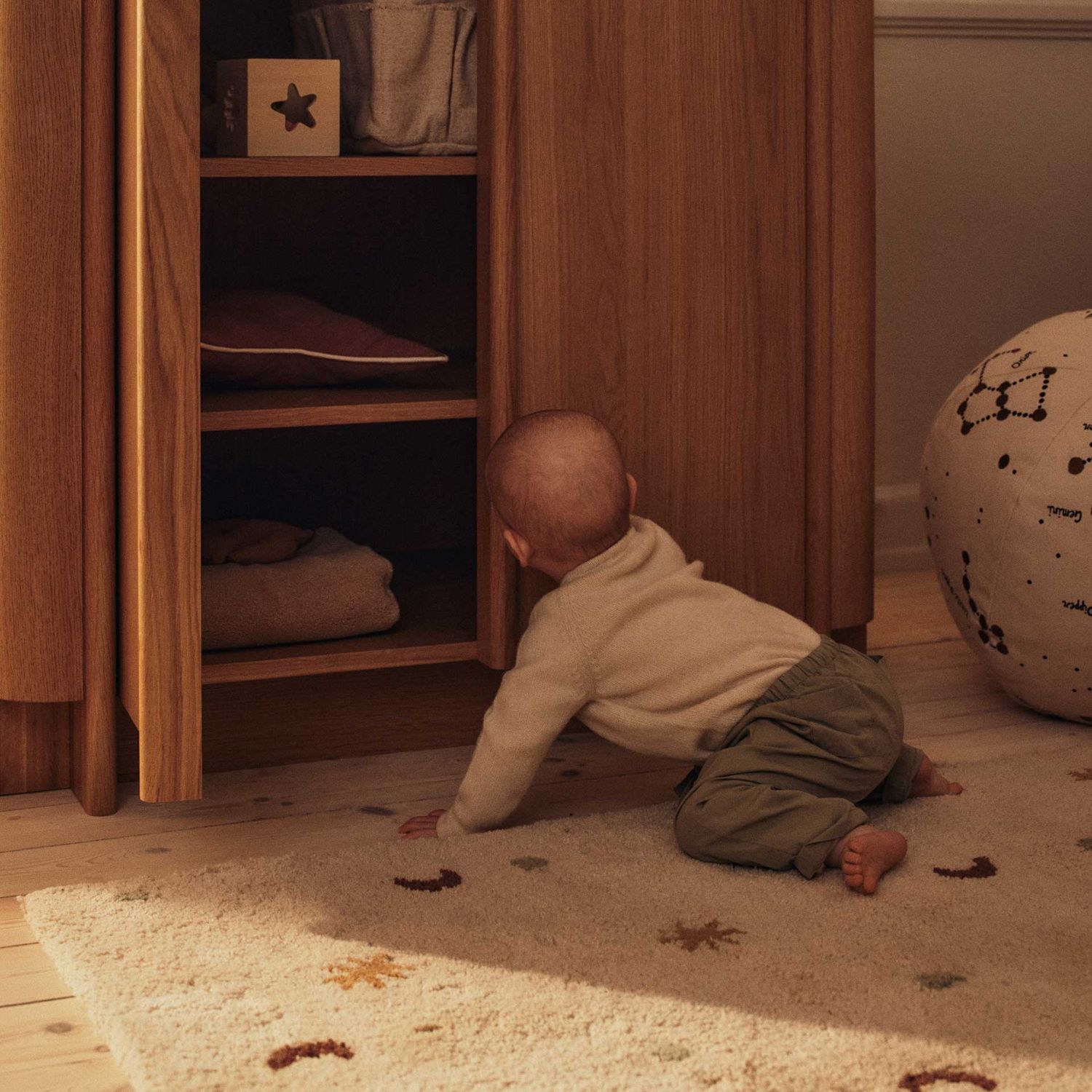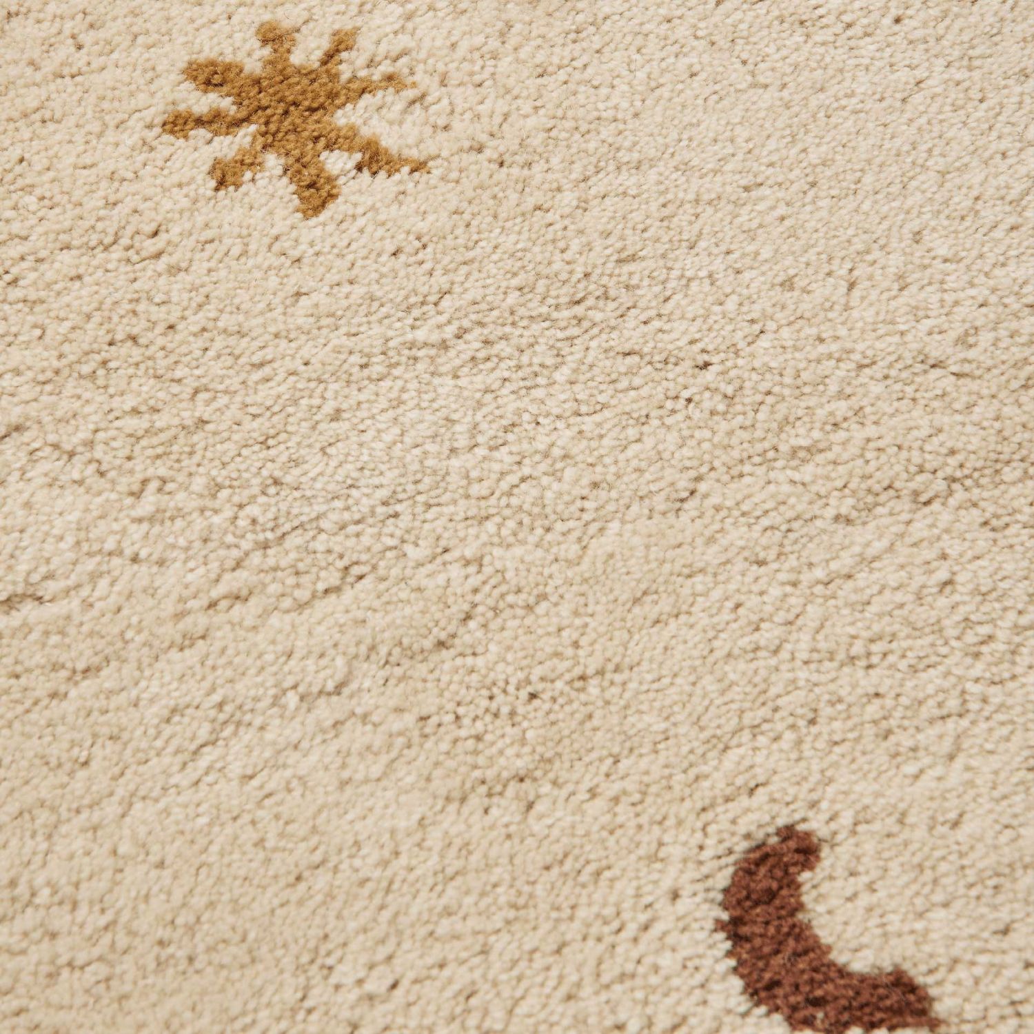 Die Gestaltung des Ferm Living - Skye Teppich zeigt verstreute Monde, Sterne und Punkte. Diese Elemente erzeugen einen ruhigen visuellen Rhythmus und machen den Ferm Living - Skye Teppich zu einem dekorativen Bestandteil im Raum.