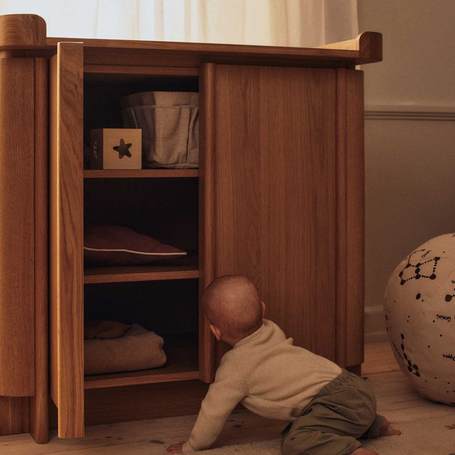 Die Ferm Living - Tilu Kommode kann mit dem passenden Wickelaufsatz ergänzt werden und wird so zu einer funktionalen Wickelstation. Nach der Wickelzeit lässt sich die Ferm Living - Tilu Kommode wieder als klassisches Möbelstück nutzen, ohne dass sichtbare Veränderungen bleiben.