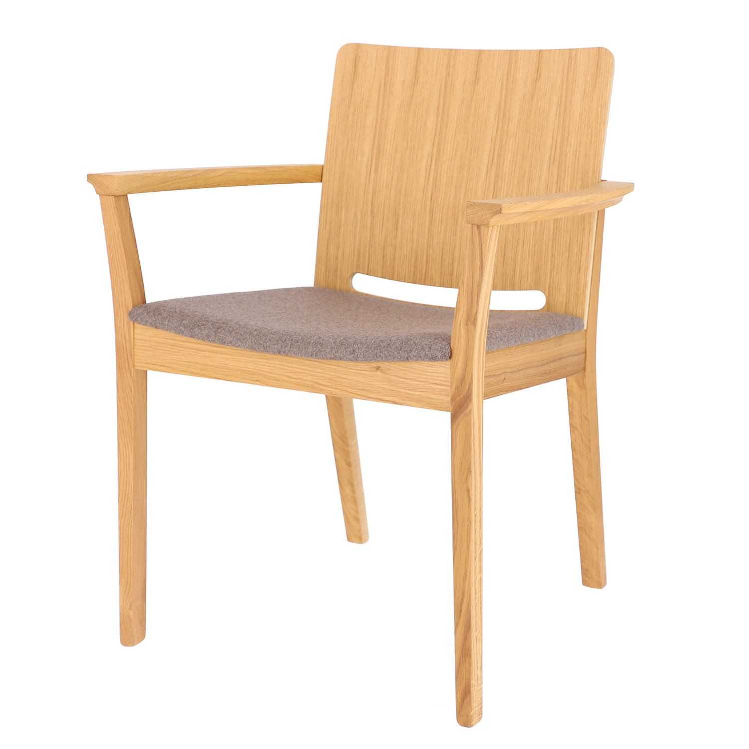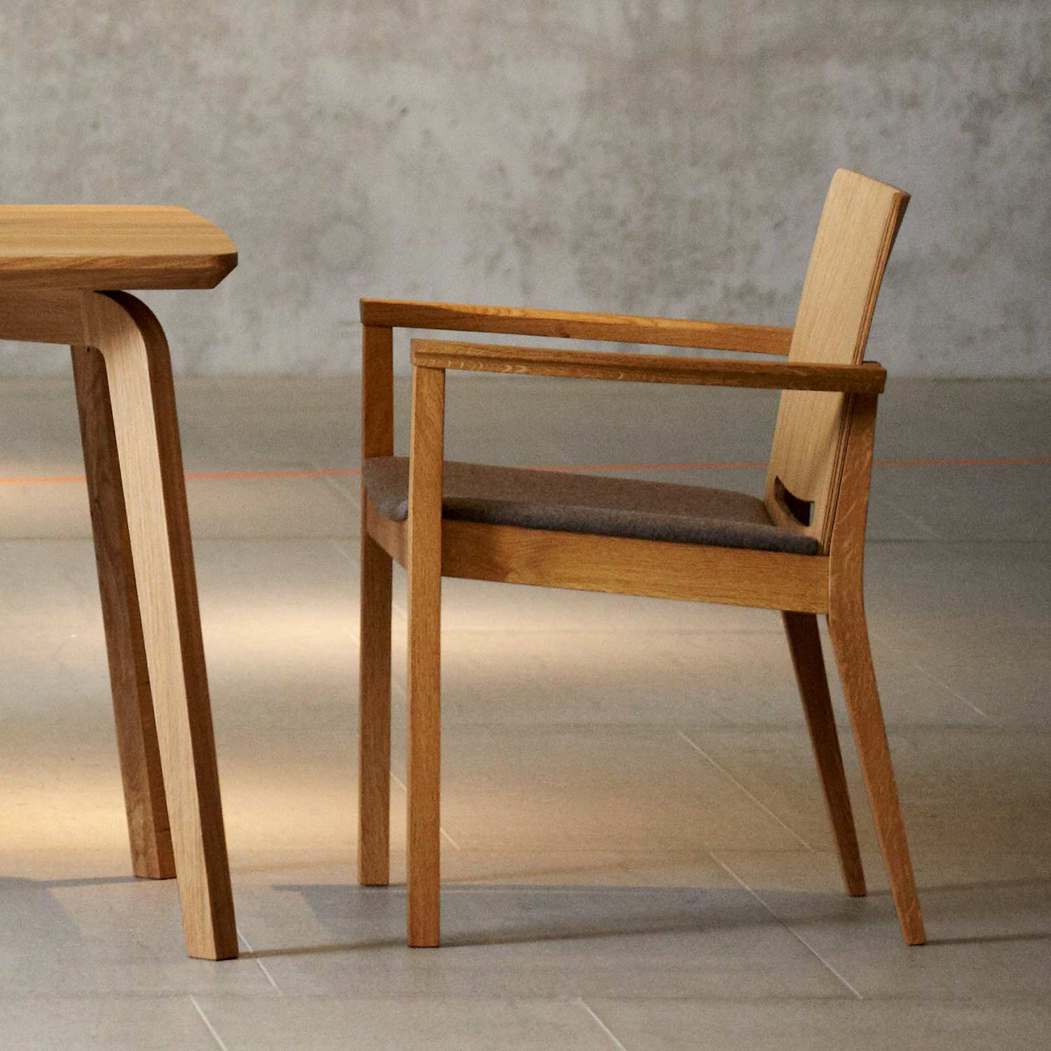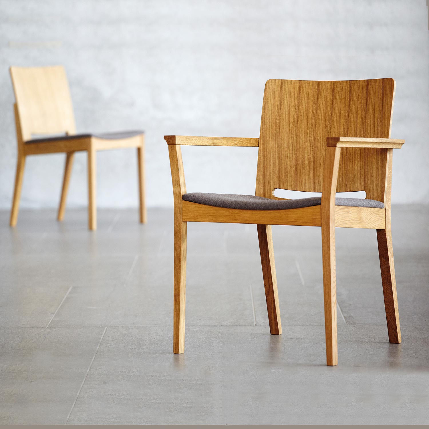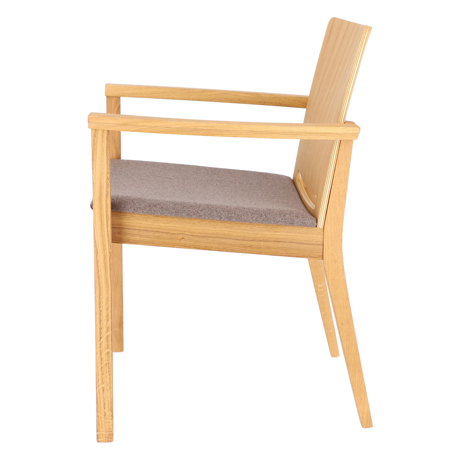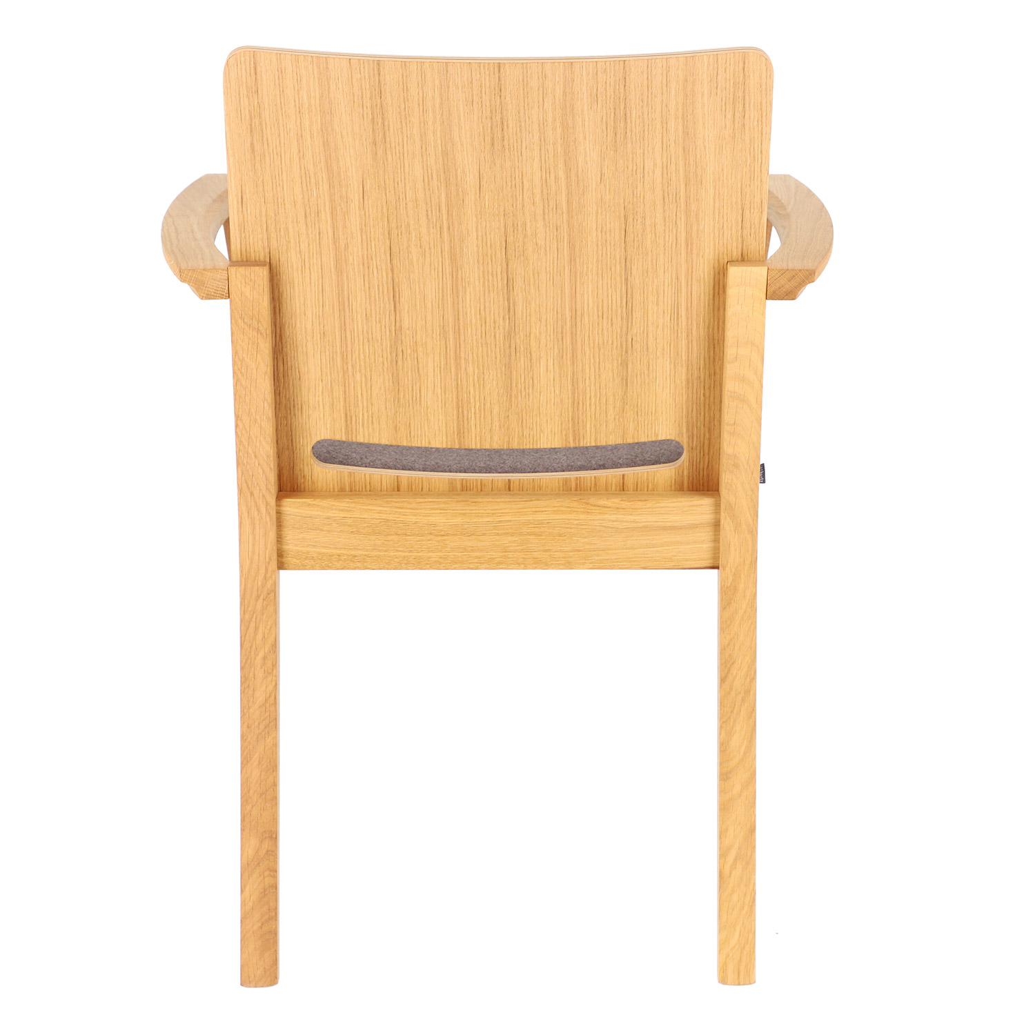 Dieser Stuhl besticht durch seine geschwungenen Armlehnen und die abgerundete Rückenlehne, die nahtlos in das Gestell übergehen. Die Sitzfläche ist mit teflonbeschichtetem Loden (100% Schurwolle) bezogen, was für besonderen Komfort sorgt.