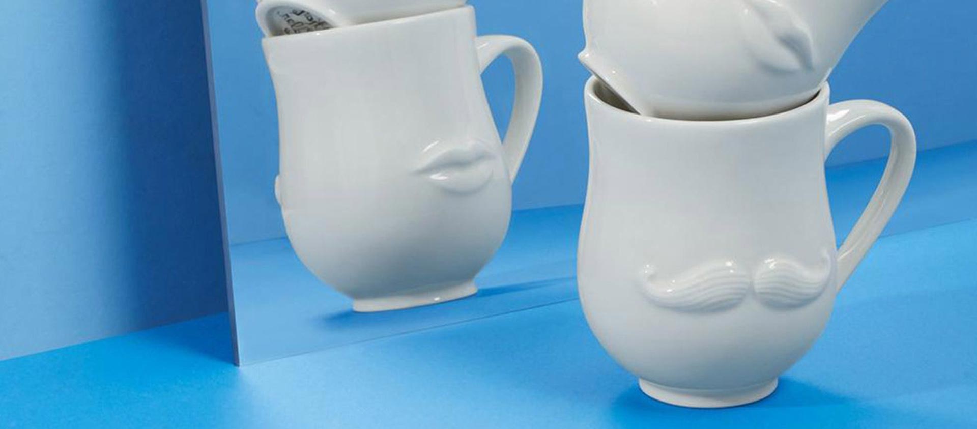 | Skulpturale Formen & ikonische Gesichter | Die Tasse wirkt wie ein Kunstobjekt und setzt starke Akzente auf Tisch und Sideboard. |