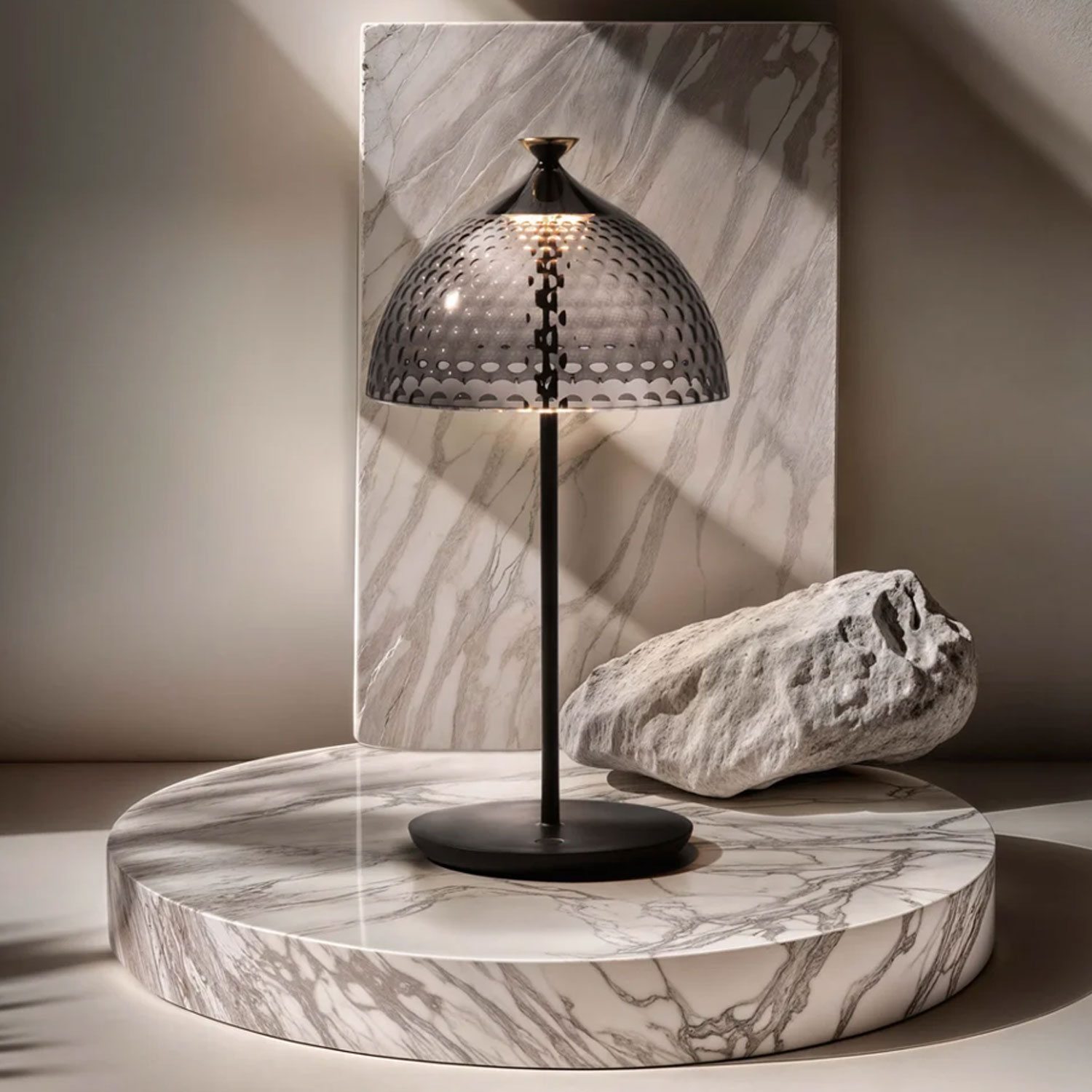 Die Kartell - Pumo Tischlampe besteht aus einem Aluminiumfuß und einem Lampenschirm aus recyceltem PMMA, einem thermoplastischen Technopolymer. Die strukturierte Oberfläche des Schirms erzeugt faszinierende Lichtreflexionen und verleiht der Leuchte eine einzigartige Ästhetik.