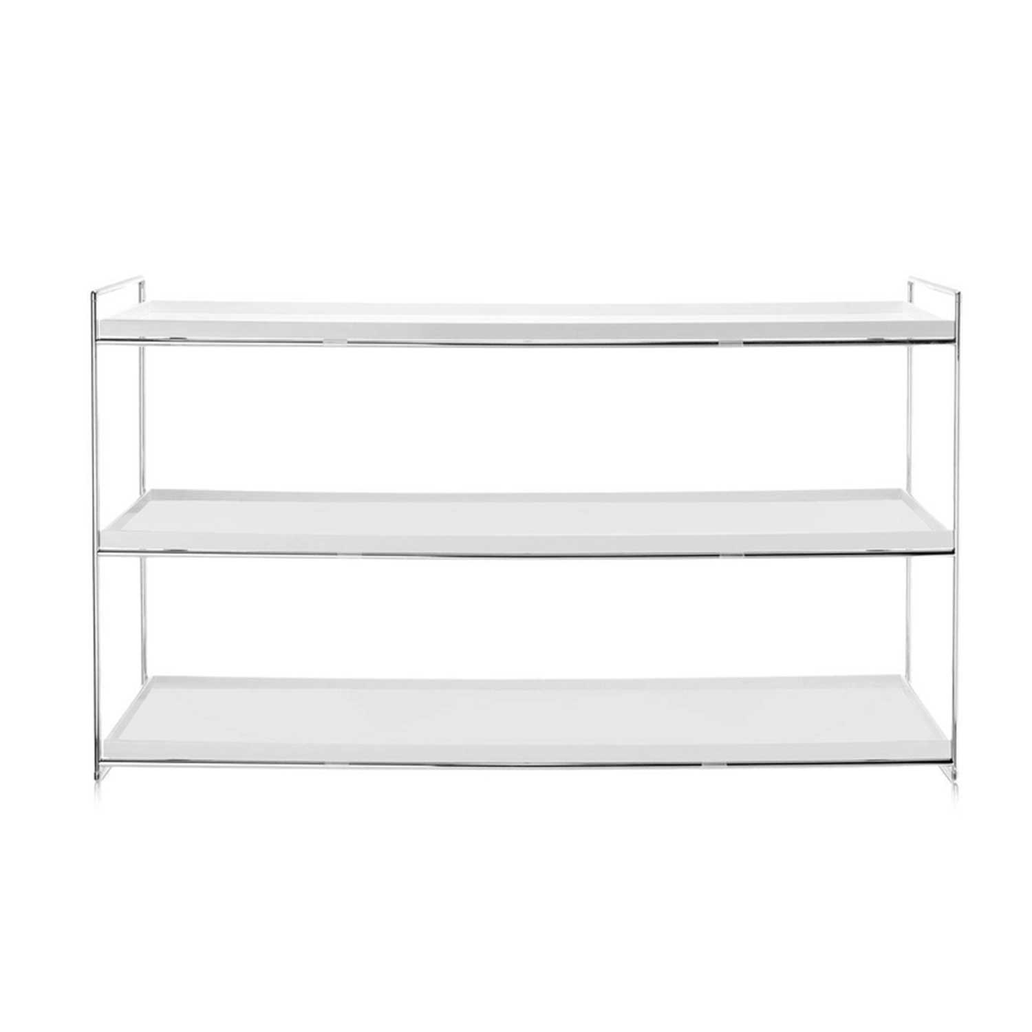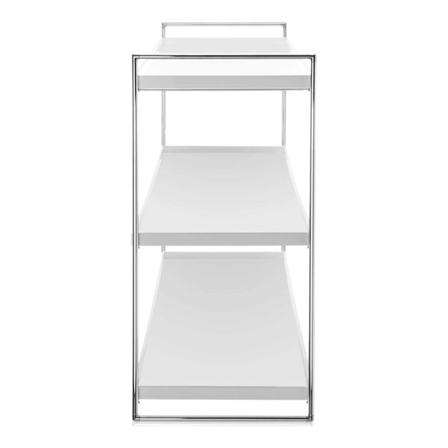 Das Kartell - Trays Regal, entworfen von Piero Lissoni, interpretiert das Bild japanischer Tabletts neu – als schlankes Regalsystem. Drei glänzende Regalböden aus durchgefärbtem PMMA schweben auf einem verchromten Stahlrohr-Gestell, das minimale Präsenz und maximale Eleganz in Wohnraum oder Büro schafft.