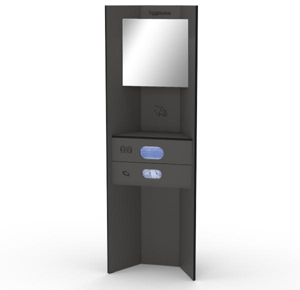 Beim Betreten des Raums bemerkt man die Hygienestation. Ihre Ästhetik erinnert an moderne Möbel fürs Büro oder Bad. Nach den Kontakten mit Oberflächen und Personen im öffentlichen Nahverkehr lädt die Station zur Benutzung ein. Berührungslos liefert der Spender das Desinfektionsmittel für die Handreinigung.