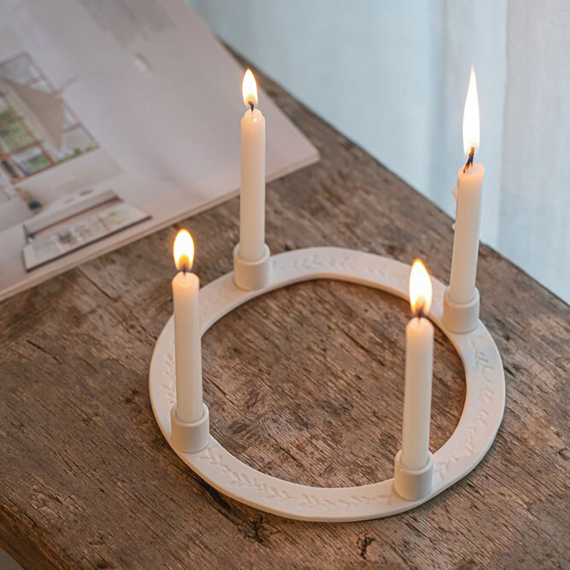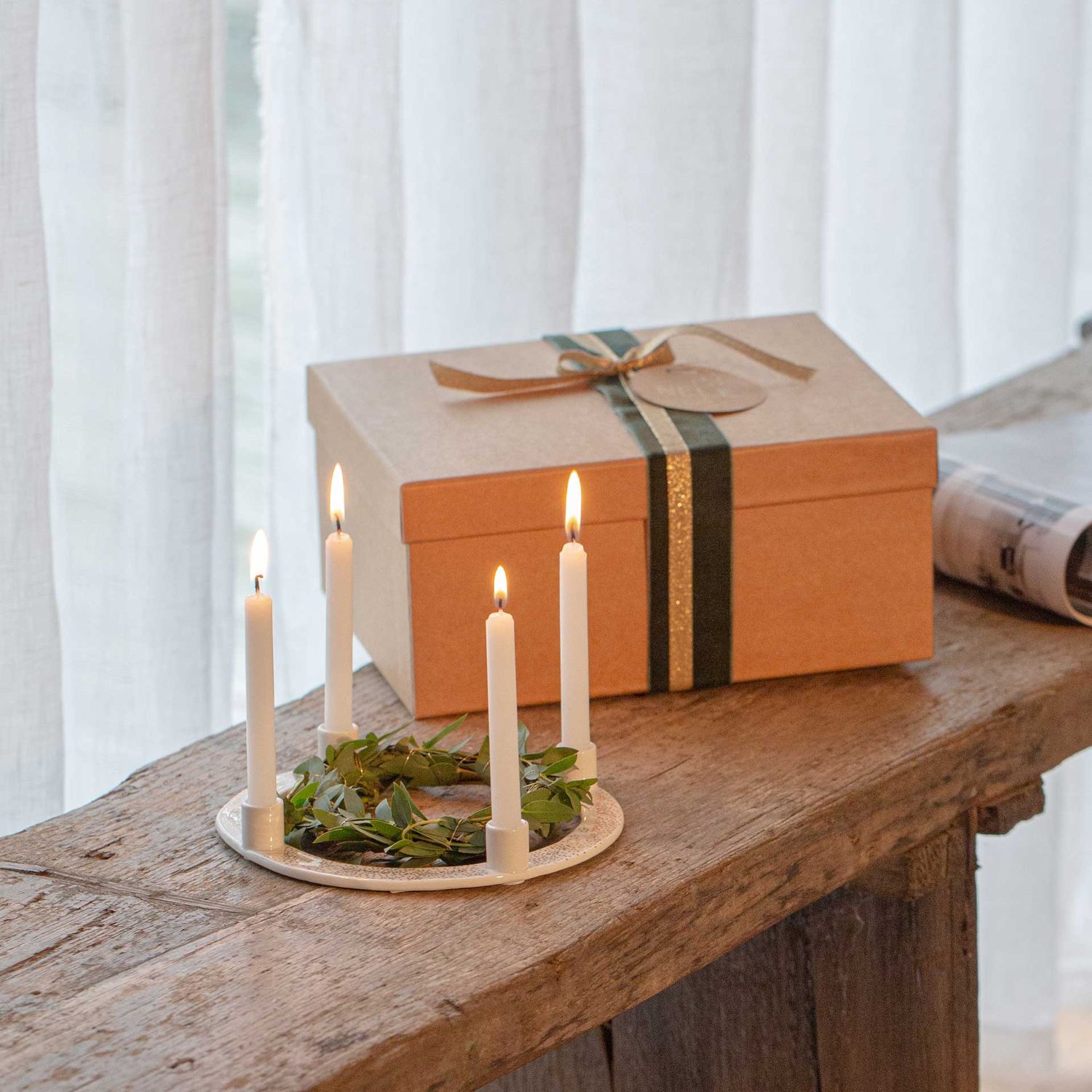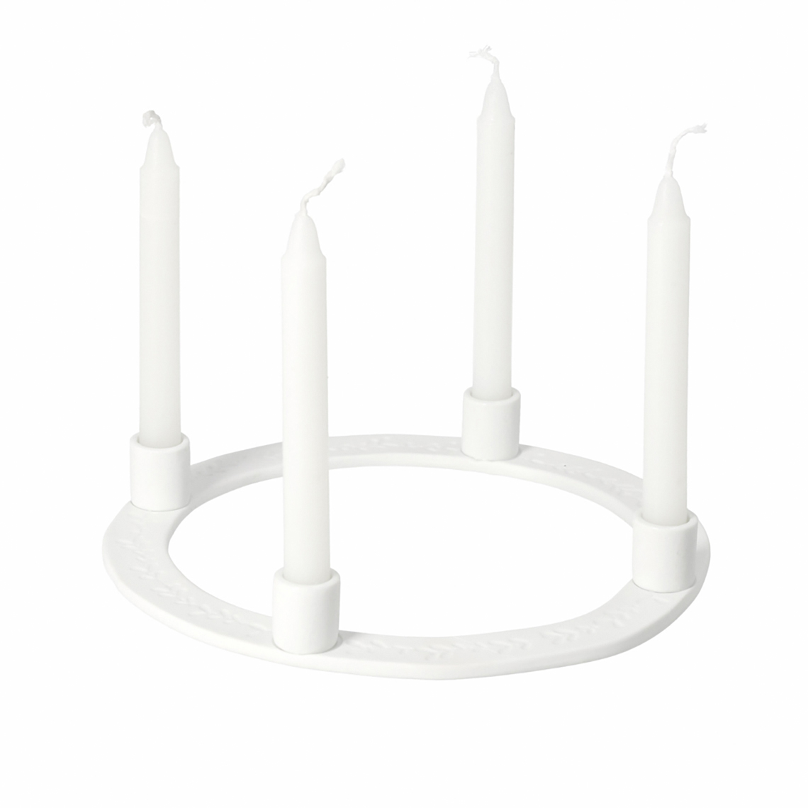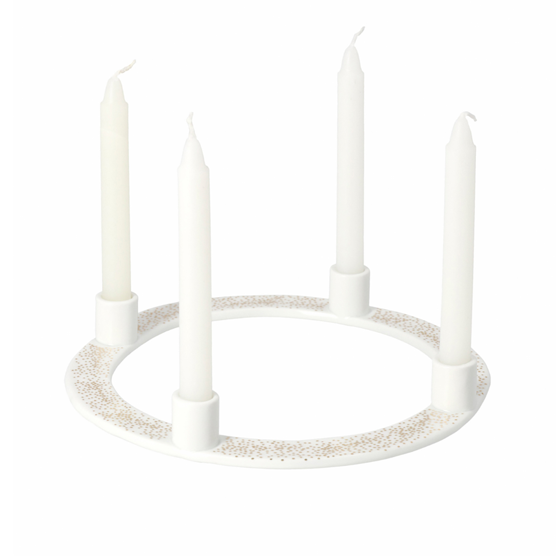 Ob festlich geschmückt oder puristisch inszeniert – der Räder Design Kerzenkranz bringt eine zeitlose Eleganz auf Ihren Tisch. Gefertigt aus feinem Porzellan und gestaltet mit dezentem Blättermuster oder zartem Punktdekor in Gold, wird dieses Wohnaccessoire zur modernen Interpretation des klassischen Adventskranzes. Er eignet sich ideal für vier schlanke Stabkerzen / Baumkerzen und lässt sich nach Belieben mit kleinen Zweigen, Kugeln oder Figuren ergänzen.