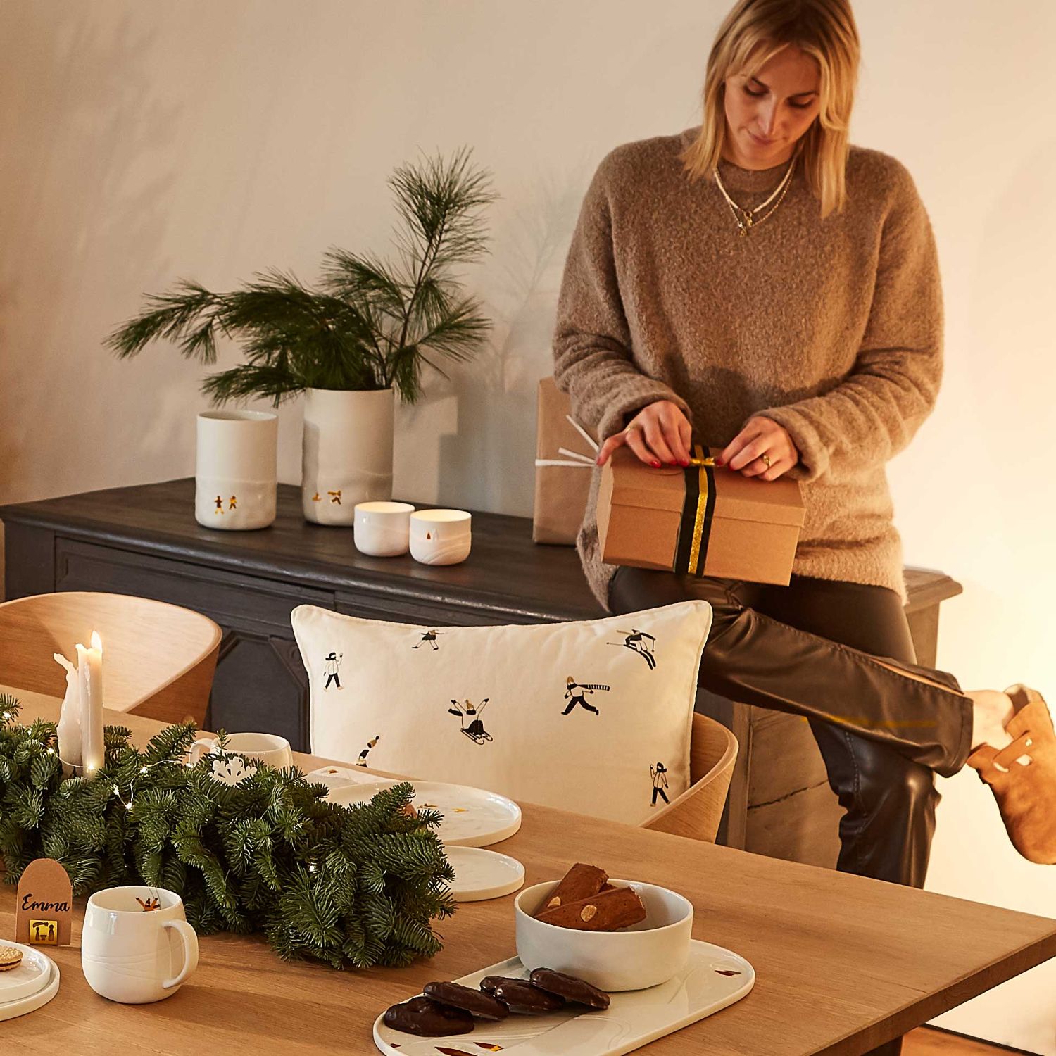 Das Design zeigt fröhliche Figuren beim Skifahren, Rodeln und Schlittschuhlaufen – kunstvoll aufgebracht und durch goldene Stickpunkte raffiniert in Szene gesetzt. Das Zusammenspiel aus Druck und Stickerei macht das Kissen Schneetag von Räder Design zu einem besonderen Blickfang – dekorativ, hochwertig und mit viel Liebe zum Detail gestaltet.