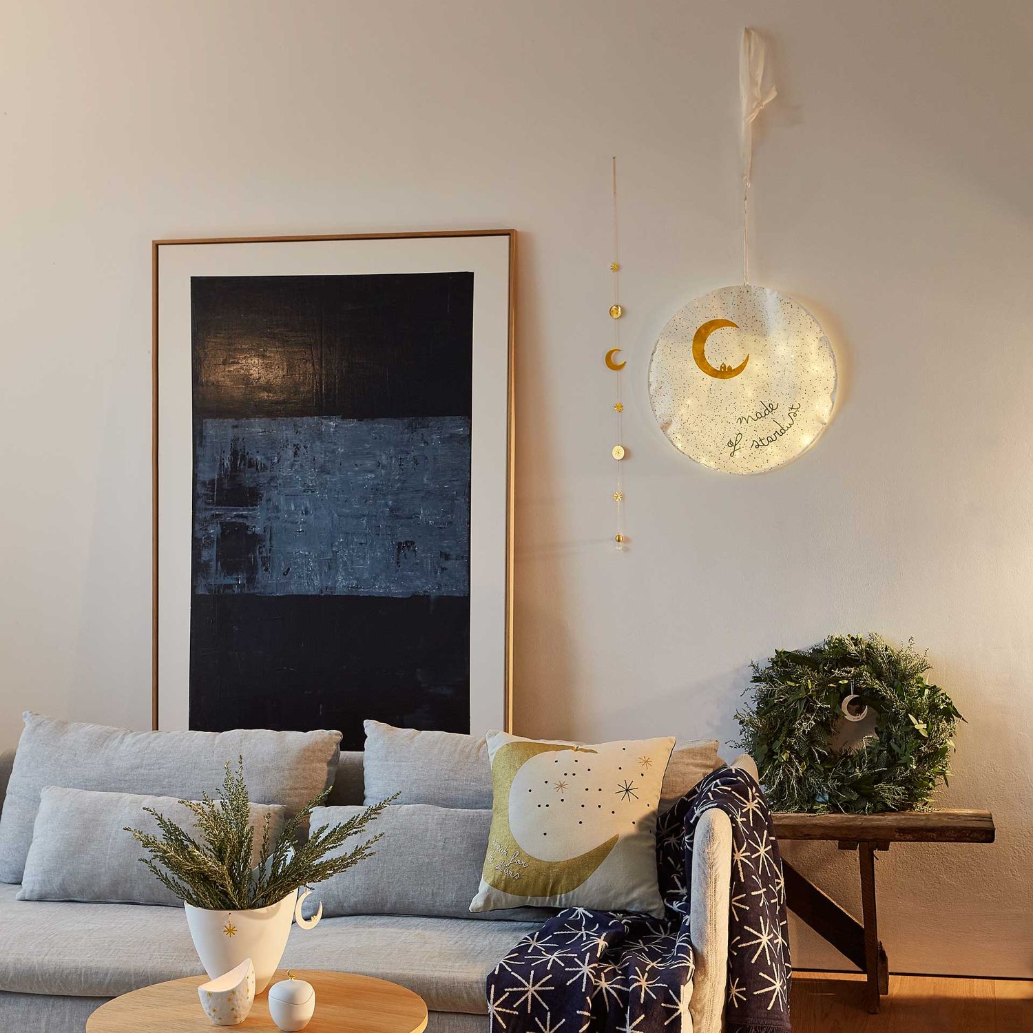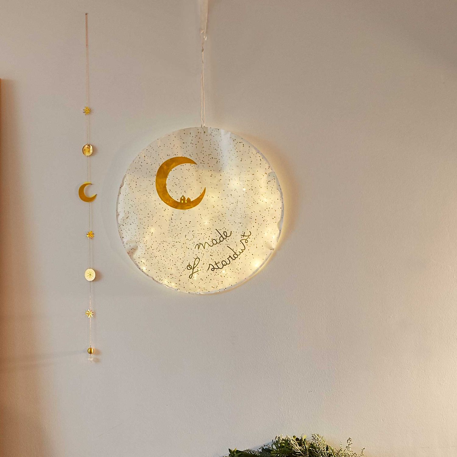 Die Lampe besteht aus hochwertigem Papier mit edlem Golddruck und wird rückseitig mit einer LED-Lichterkette beleuchtet. Das schafft ein warmes, sanftes Licht, das ideal für gemütliche Abende ist. Dank der integrierten Aufhängung lässt sich das runde Lichtobjekt einfach an der Wand anbringen – ob im Wohnzimmer, Schlafzimmer oder Kinderzimmer.