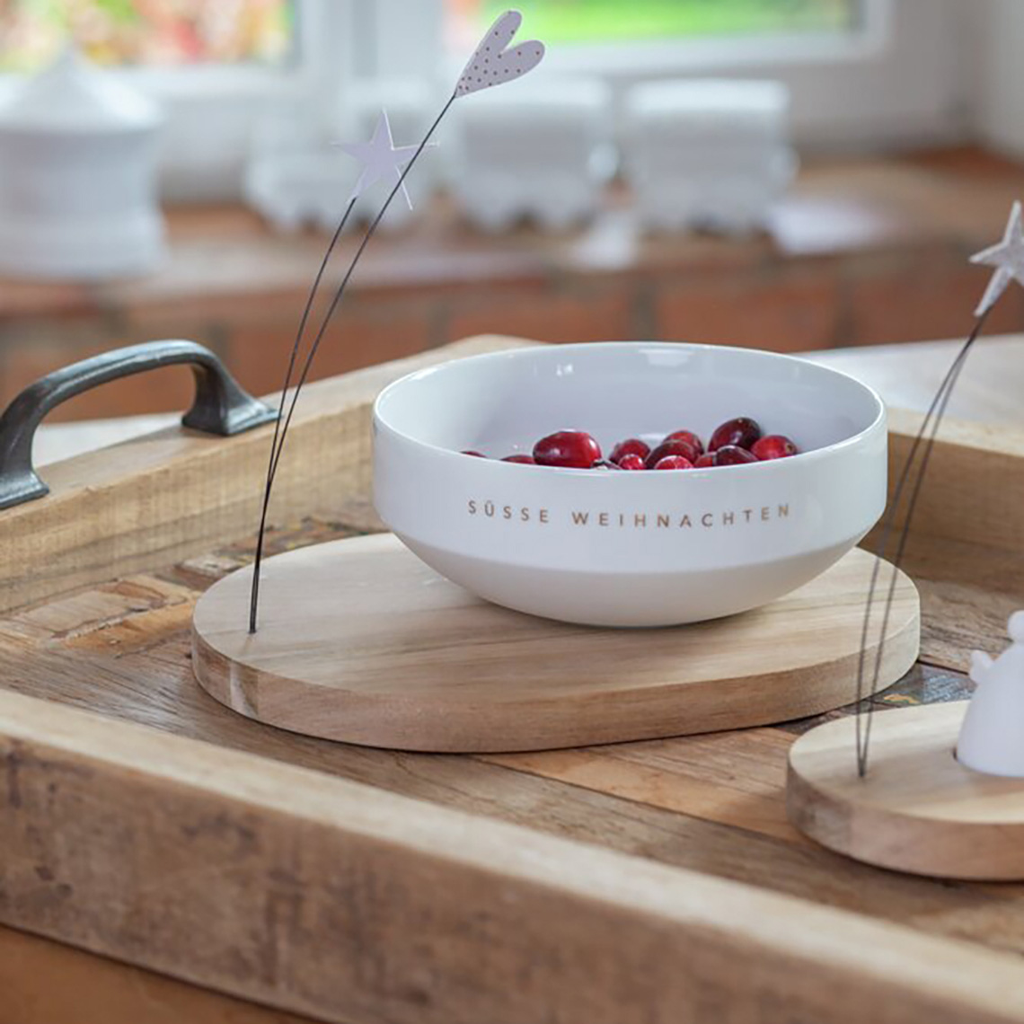 Die Räder Design Winterstadt Schale „Süße Weihnachten“ ist eine charmante Einladung, die festliche Jahreszeit mit kleinen Freuden zu genießen. Die hochwertige Porzellanschale sitzt auf einem massiven Holzsockel, der die Botschaft „SÜSSE WEIHNACHTEN“ stilvoll ergänzt. Zwei filigrane Metalldrähte mit einem Stern und einem Herz sorgen für eine liebevolle, poetische Note – perfekt für Weihnachtsplätzchen, Pralinen oder kleine Dekorationen.