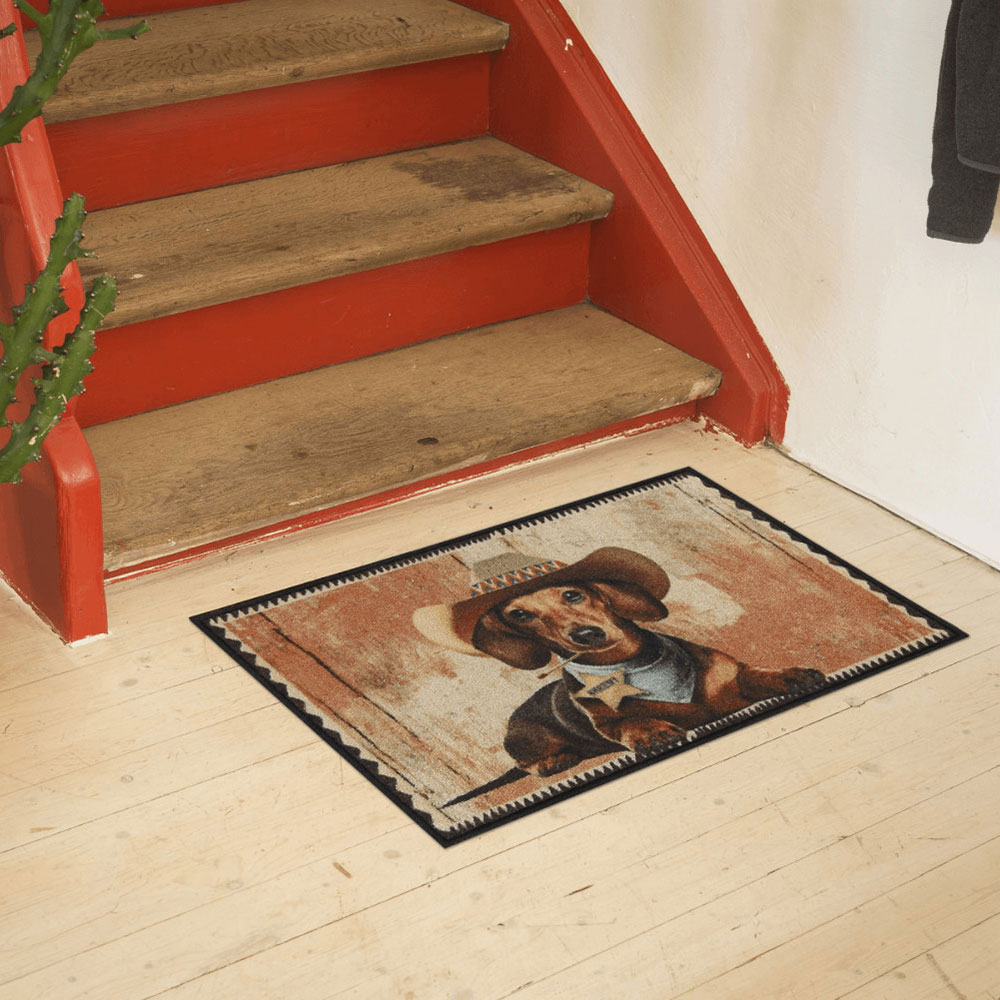Mit der Salonlöwe Deputy 50x75 cm Fußmatte ziehen Humor und Design in den Eingangsbereich ein. Ein Dackel mit Hut – detailreich illustriert – sorgt für ein Lächeln und verleiht Ihrem Zuhause eine ganz persönliche Note.
