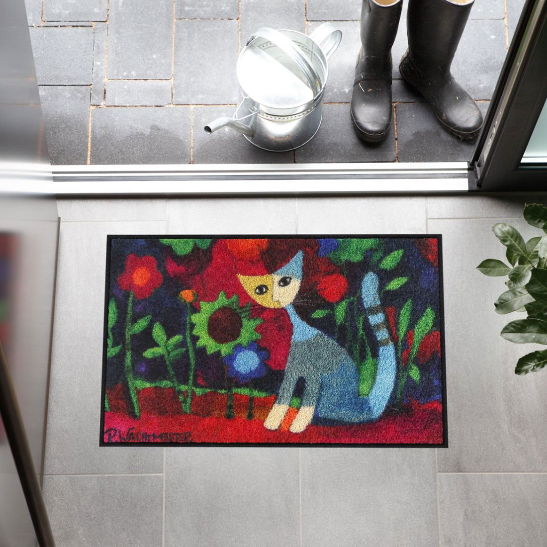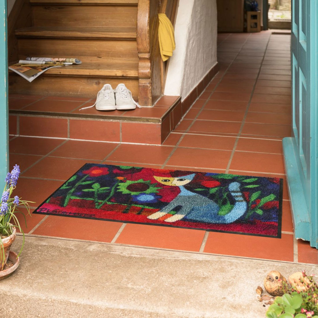Rosina Wachtmeister steht für emotionale, farbintensive Bildsprache – auch bei der Salonlöwe Mar Fußmatte. Die Katze sitzt gelassen im Zentrum des Motivs und wird von zarten Blumen umrahmt. So entsteht ein stiller, künstlerischer Blickfang, der jeden Eingangsbereich veredelt.