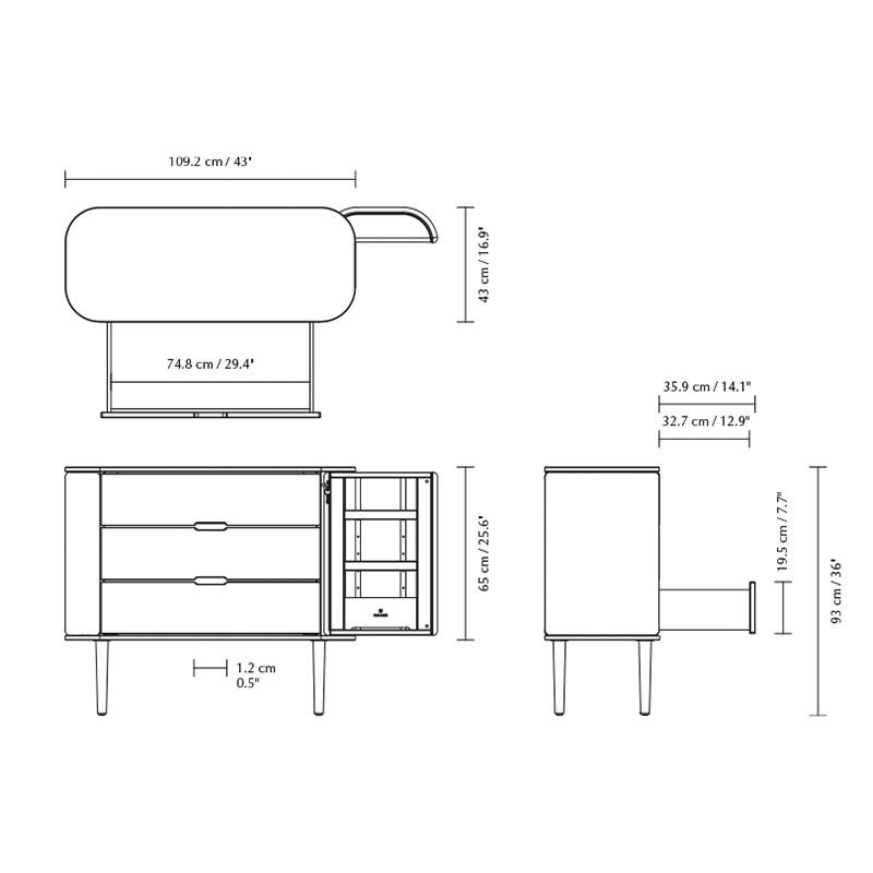 Die geschwungenen Seiten öffnen sich wie Flügeltüren und bieten Platz für Kerzen oder edle Spirituosen. Die Schubladen eignen sich zum Aufbewahren zum Beispiel von Servietten oder Tischdeko oder natürlich auch Bürobedarf.